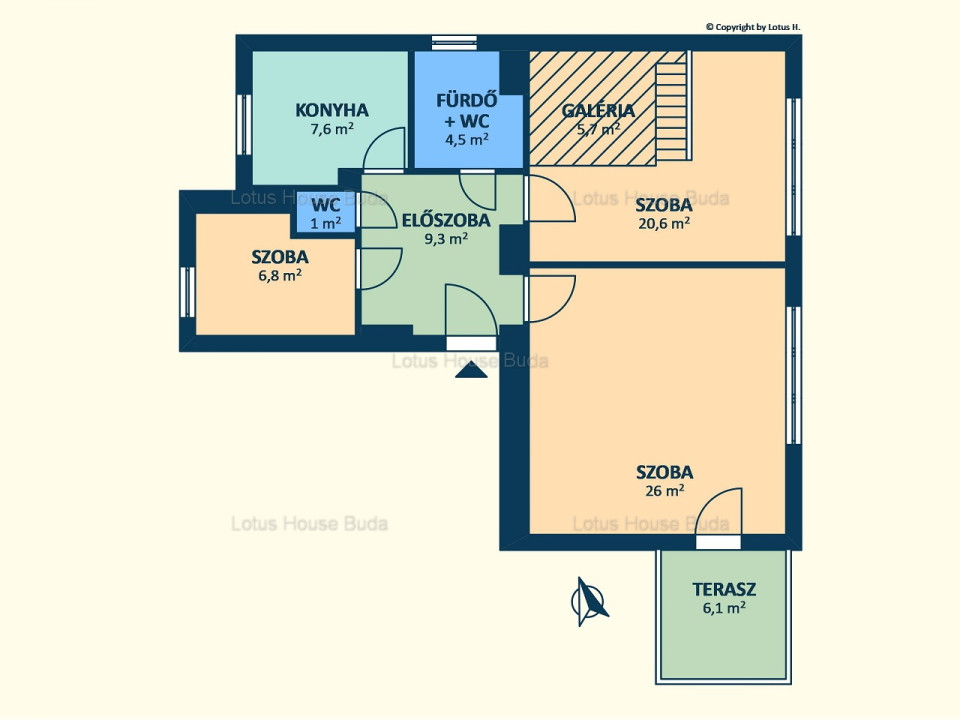 A lakás alapterülete 81nm, a szobák 26nm, 20,6nm (galéria 5,7nm), míg a kisszoba 6,8nm nagyságú.