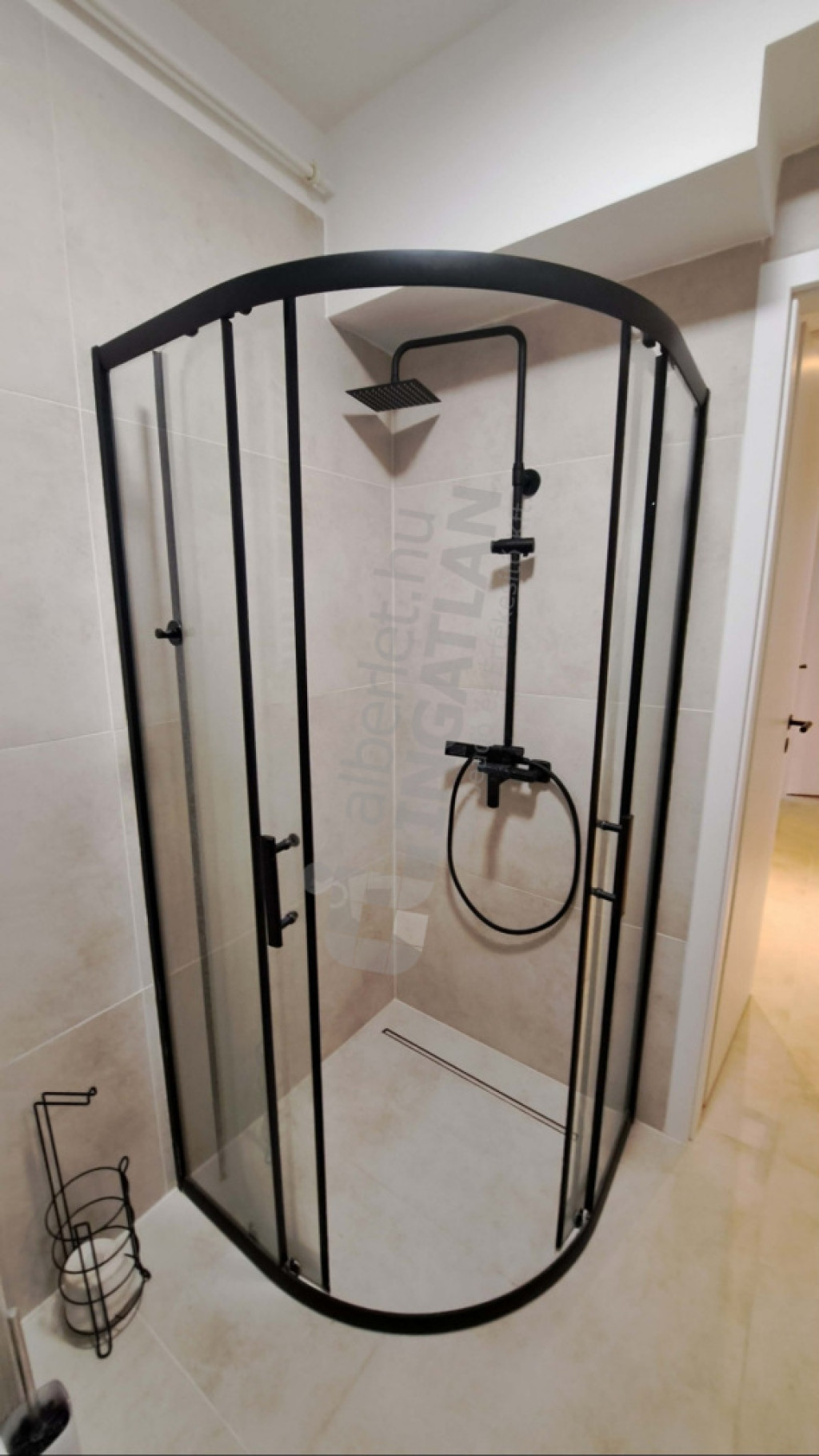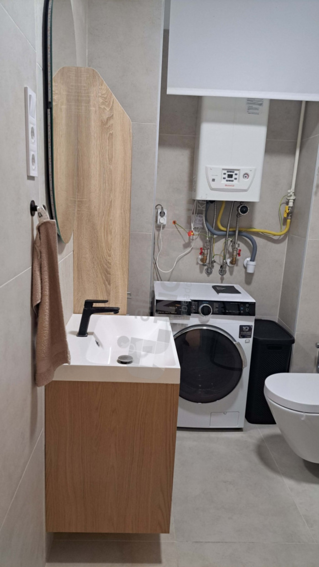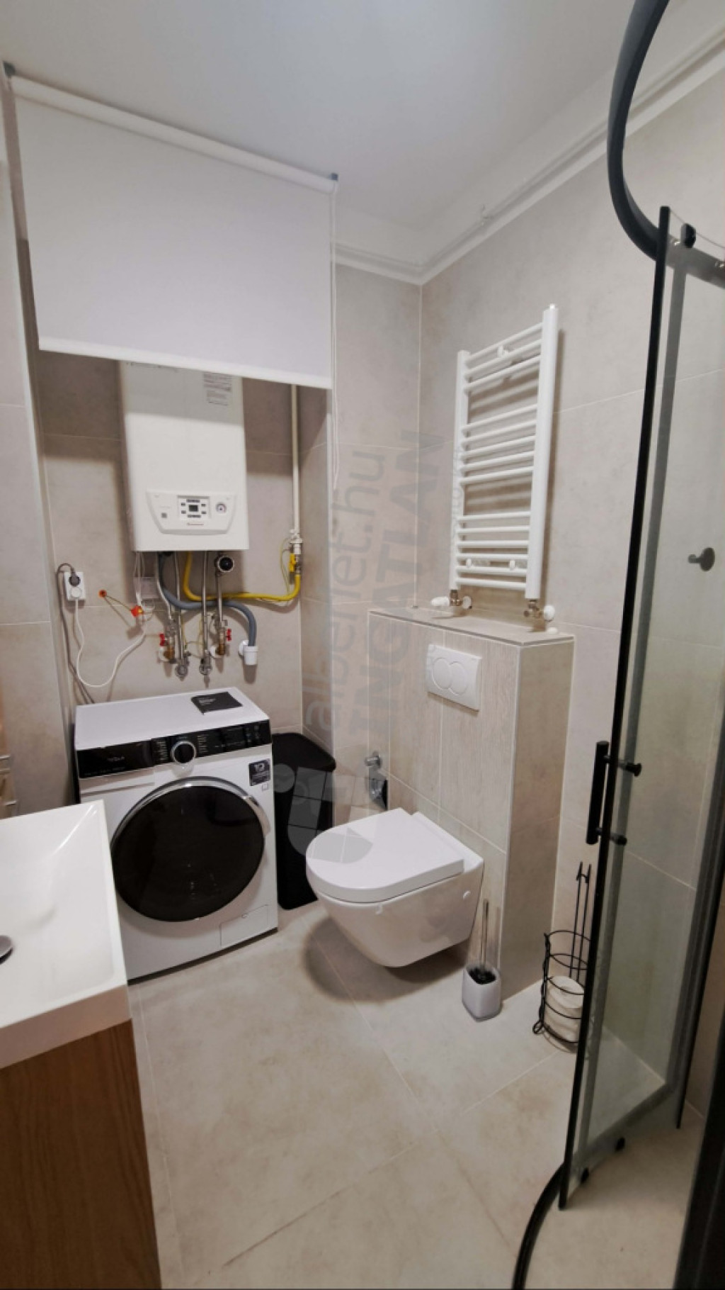 - 5 nm-es fürdőszoba zuhanyzóval, mosdóval és WC-vel, mosó-szárító géppel