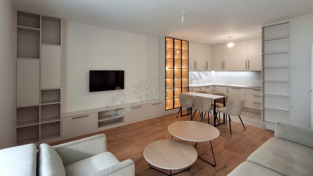 Az ingatlan modern, átgondolt elrendezésű: tágas nappali-amerikai konyhás térrel, két külön nyíló hálószobával és két elegáns fürdőszobával rendelkezik, így ideális választás akár pároknak, akár kisebb családok számára is. A lakás teljes körűen, magas minőségű bútorokkal és gépesítéssel felszerelt, minden részletében a kényelmet és az igényességet tükrözi.