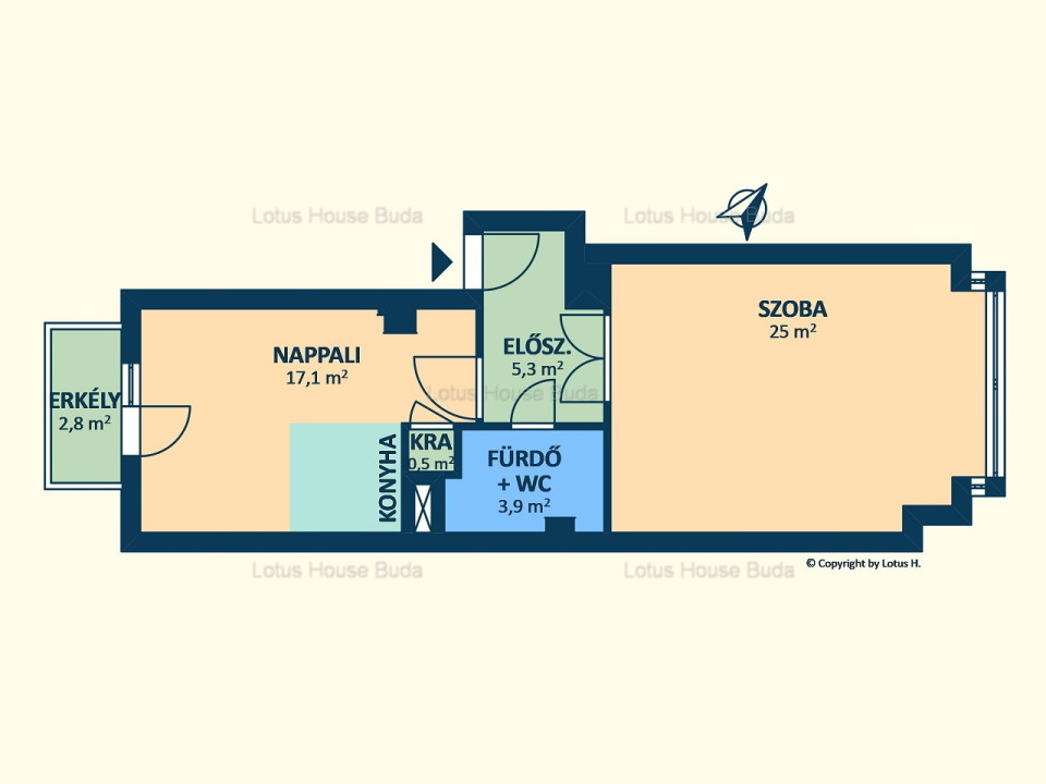 A lakás alapterülete 54nm, amelyből a nappali 17,1nm, a szoba 25nm.