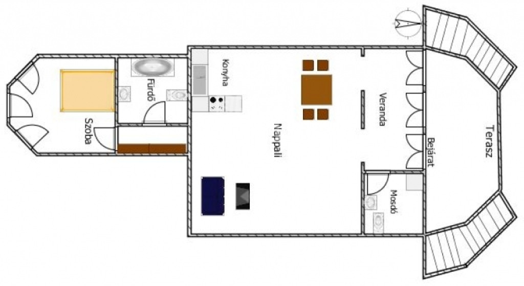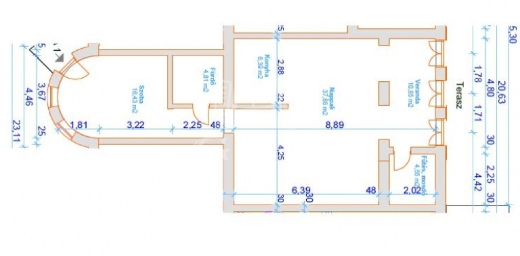 A nappali, konyha és étkező keleti tájolású, kertre néző, innen nyílik a terasz is.