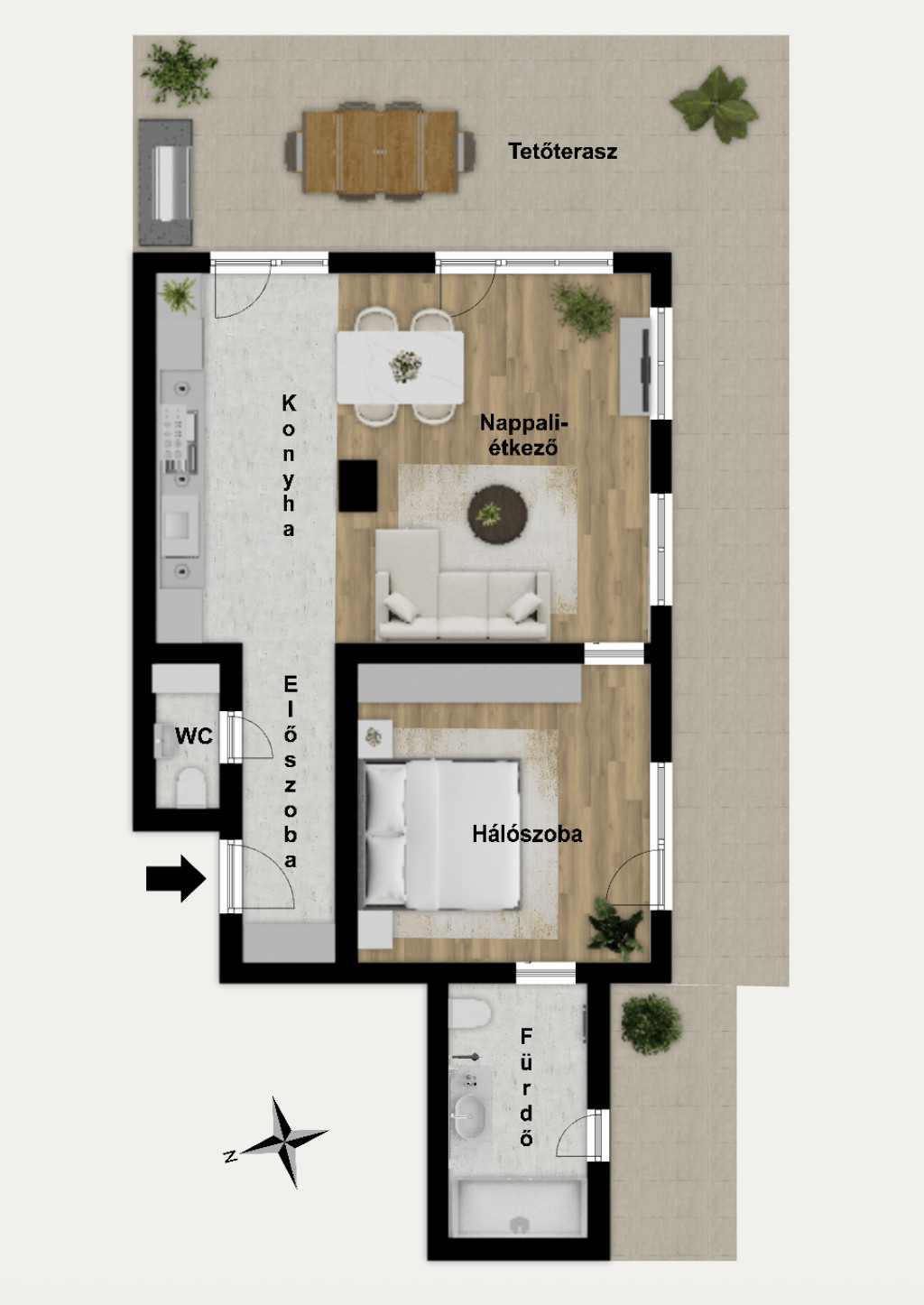 Az elrendezés kifejezetten tágas és elegáns: egy hatalmas amerikai konyhás nappali étkezővel, egy külön hálószoba saját, privát fürdőszobával, valamint egy külön vendég WC és mosókonyha helyiség szolgálja a lakók kényelmét.