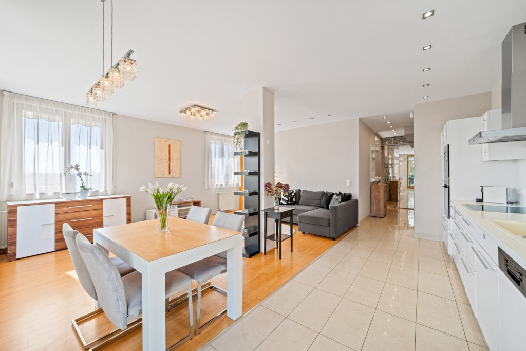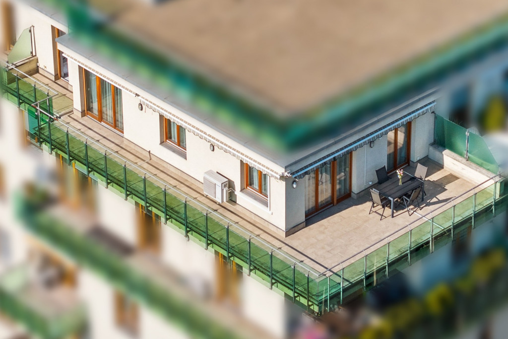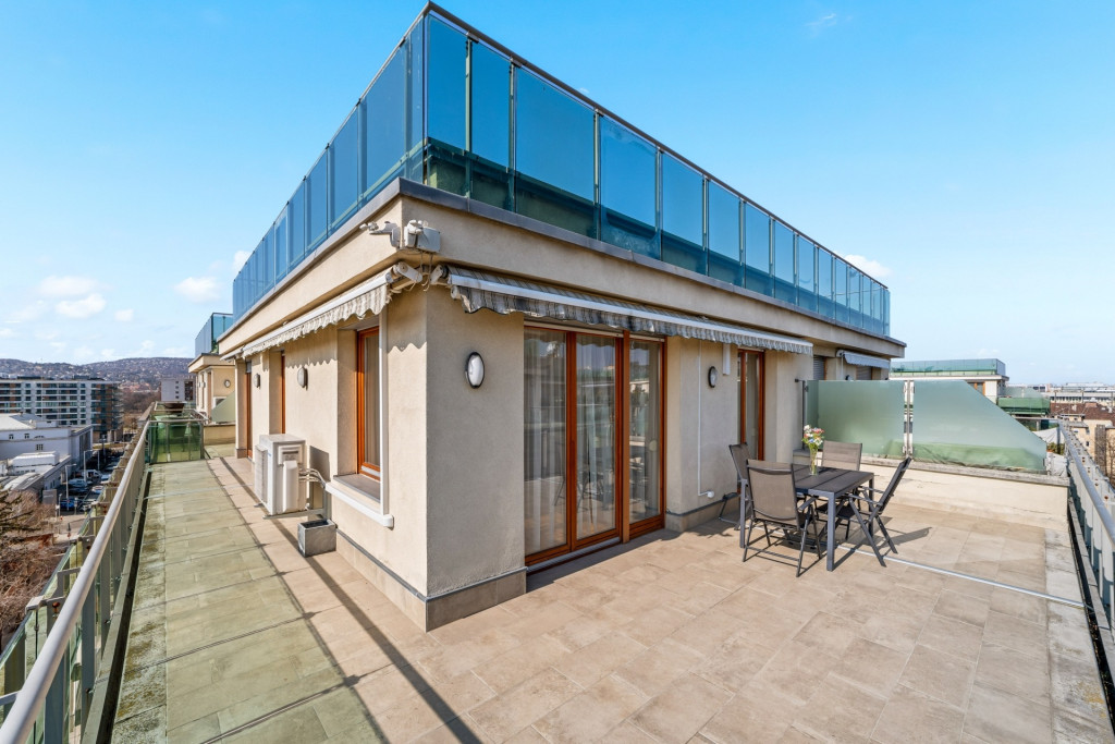 A lakás egyik legnagyobb értéke a panorámás, körbejárható tetőterasz, amely ideális pihenésre, reggeli kávézásra vagy akár baráti összejövetelekre is.