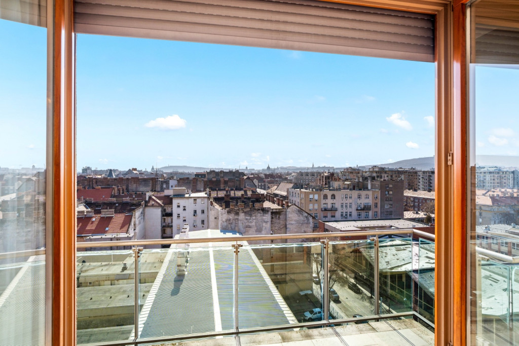 Kiadó Budapest XIII. kerületében, Újlipótváros egyik legkedveltebb részén, a modern Cézár Ház épületében egy különleges adottságokkal rendelkező, legfelső, 9. emeleti penthouse lakás.