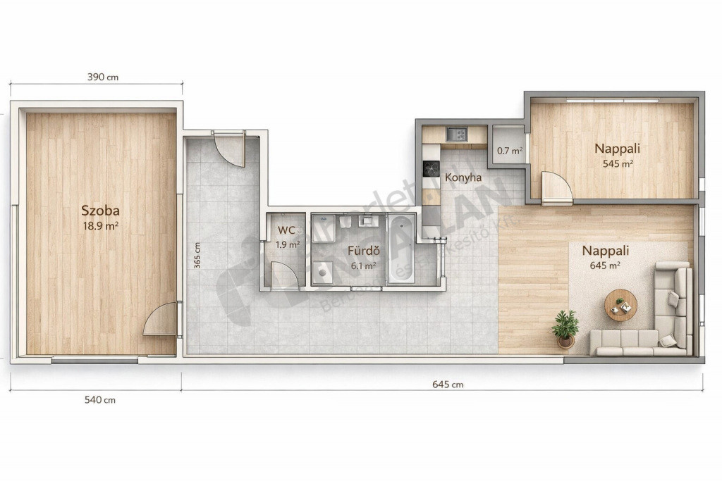 a 19 nm-es nagy szoba leválasztással lett kettéosztva, így alakult ki egy plusz félszoba