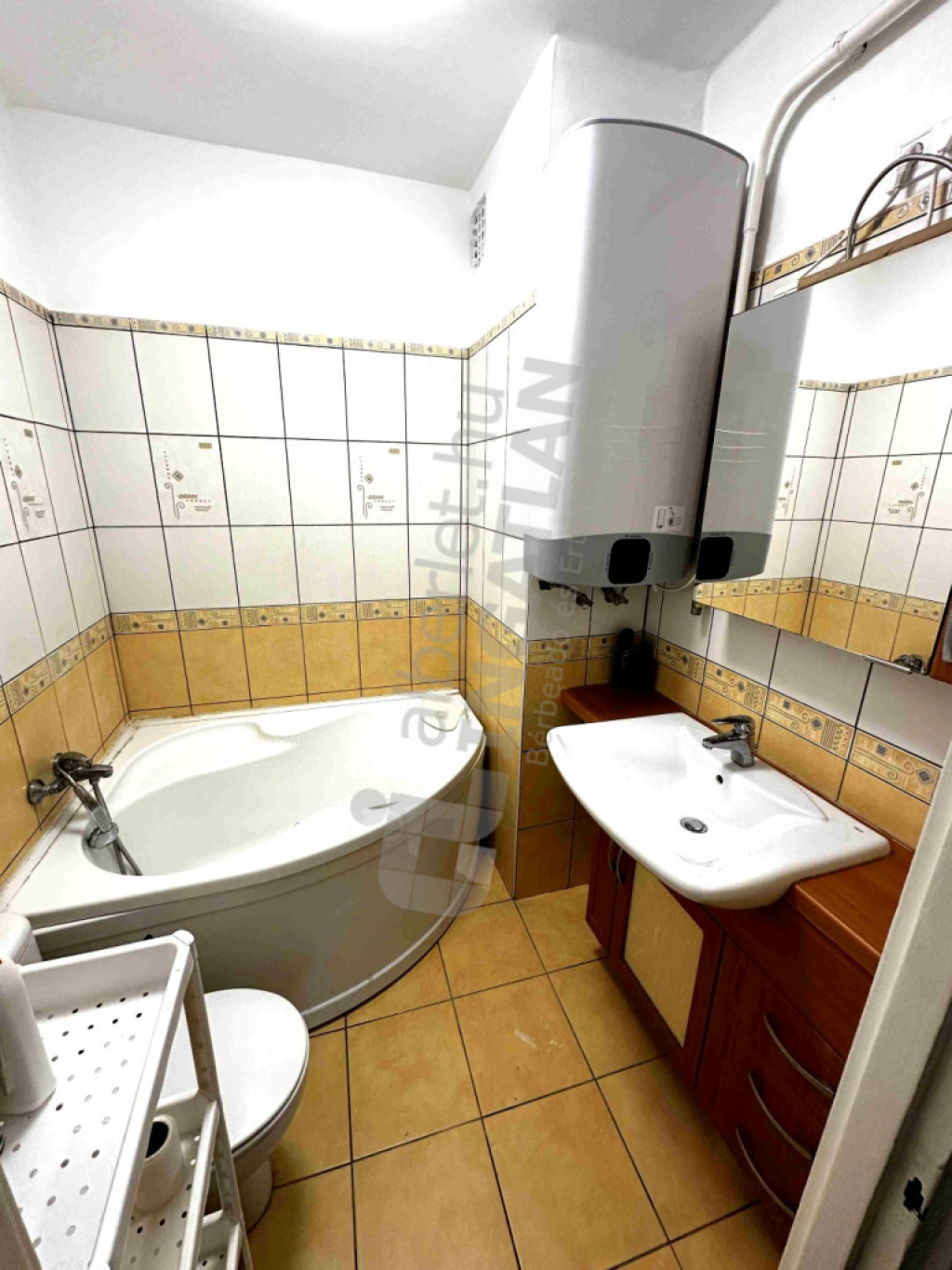 Részben bútorozott, gépesített, sarokkádas fürdőszoba, klimatizált.