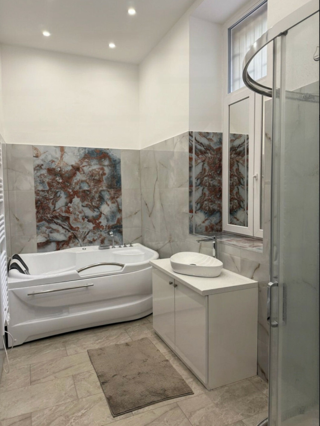 A konyha és az ebédlő az előszobában lett kialakítva, onnan nyílik egy tágas fürdőszoba 2 személyes fekvő jacuzzis káddal, mosdóval, zuhanyzóval, illetve egy külön ajtóval leválasztott WC.