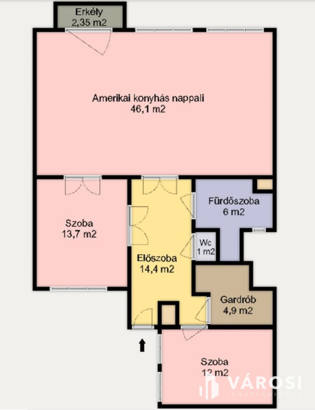 Hatalmas, 46 m2-es, amerikai konyhás nappalijával, meglehetősen egyedivé teszi az ingatlan adottságait, sőt további két, teljes értékű szoba, nagy gardrób, fürdőszoba /káddal és zuhannyal is/, külön wc és egy nagy előszoba-közlekedő is szolgálja a benne lakók kényelmét.