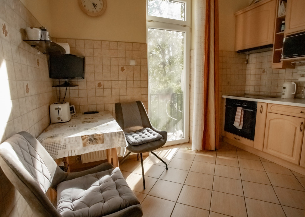 A lakás különálló konyhával, étkezővel rendelkezik, utóbbi a hallban lett berendezve.