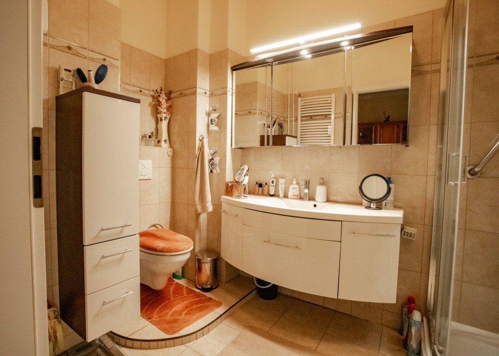 A fürdőszoba zuhanykabinos, wc-s, továbbá egy külön wc is beépítésre került.