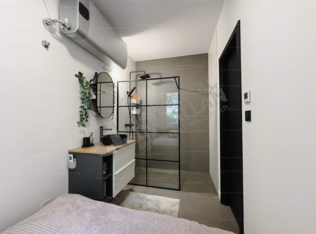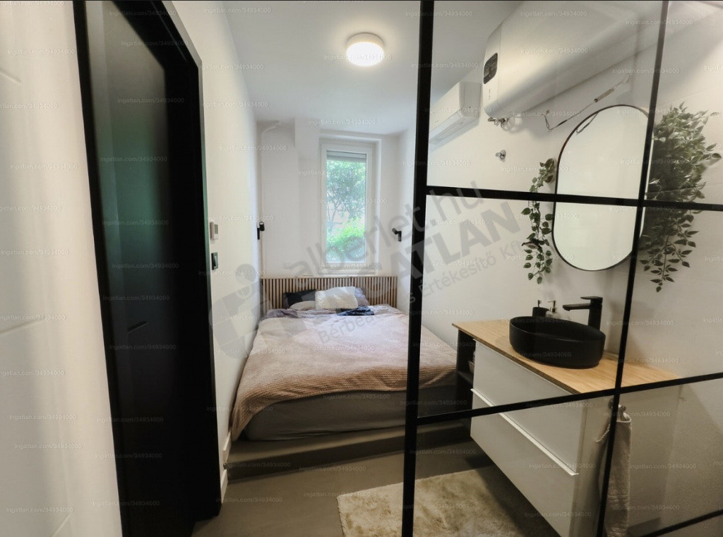 A hálószoba és a fürdő egy légtérben kapott helyet, letisztult, modern kialakítással – ideális egyedülállóknak vagy pároknak.