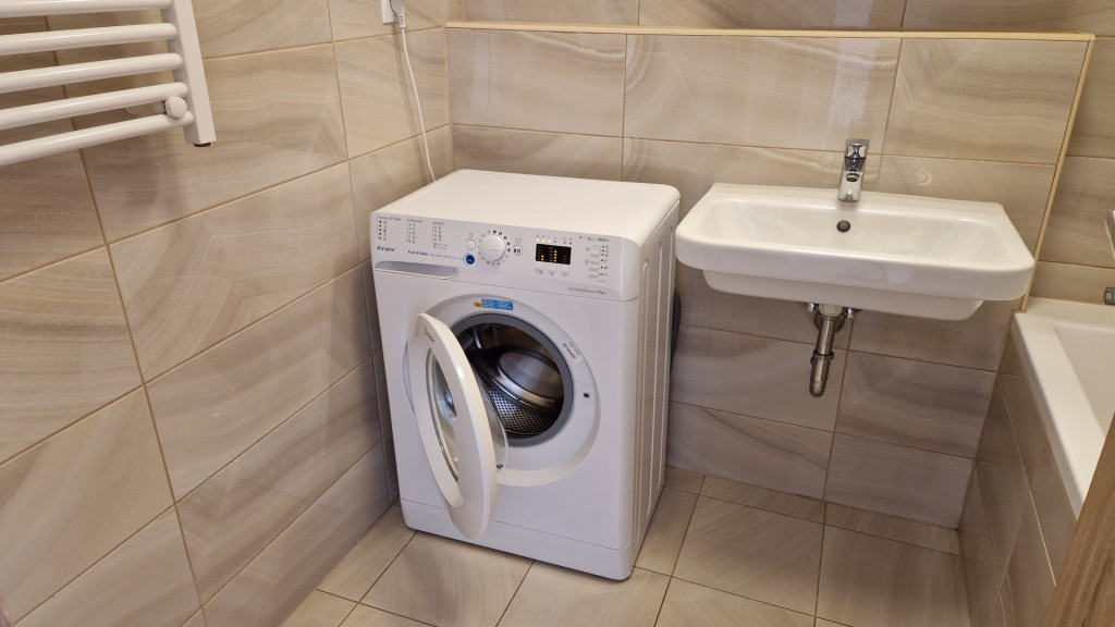 A konyha MODERN, GÉPESÍTETT (indukciós főzőlap, sütő, mikró, mosogatógép, páraelszívó, beépített hűtő), a fürdőben MOSÓGÉP található.