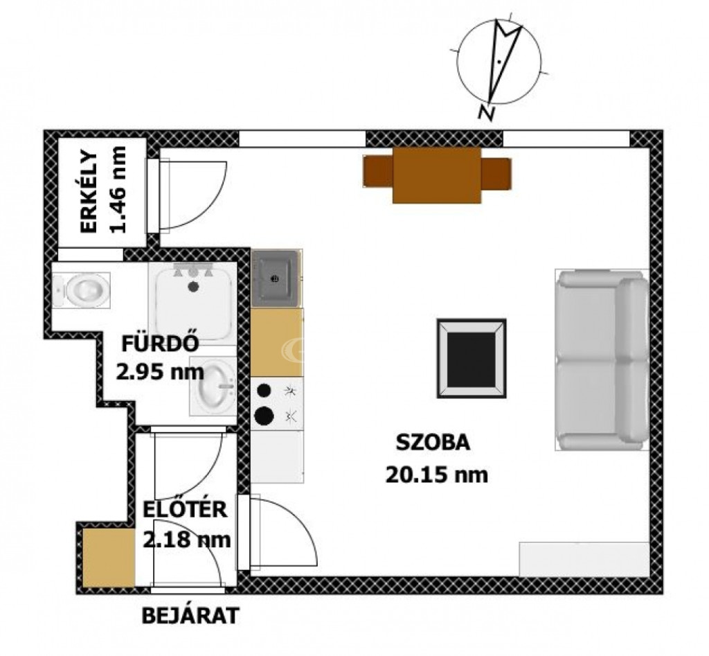 A lakás 1 szobából, konyhából és fürdőszobából áll, valamint rendelkezik egy nagy beépített gardróbszekrénnyel.