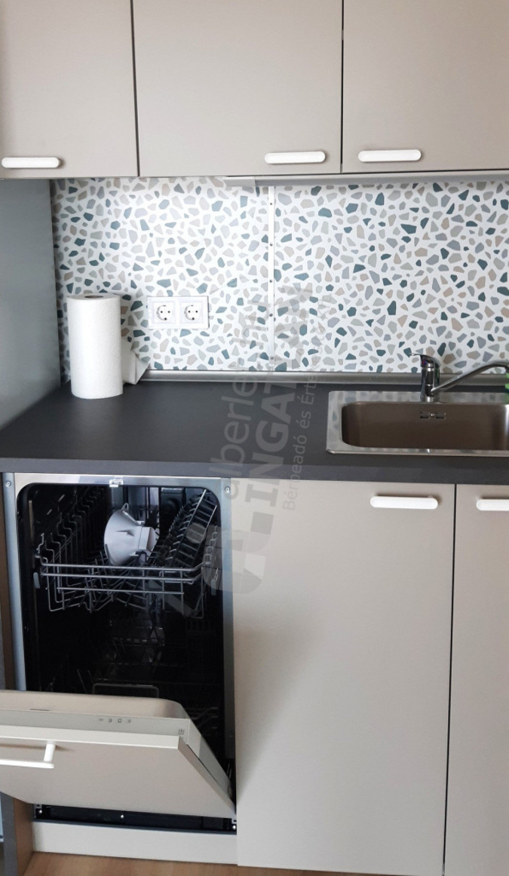 Gépesített konyha. (kerámia lap, sütő, mosogatógép, szag elszívó, hűtőszekrény).
