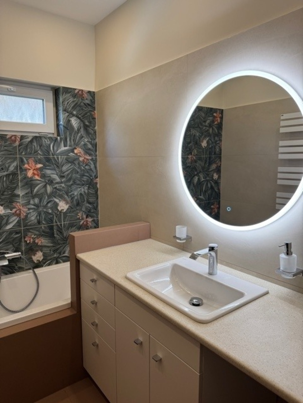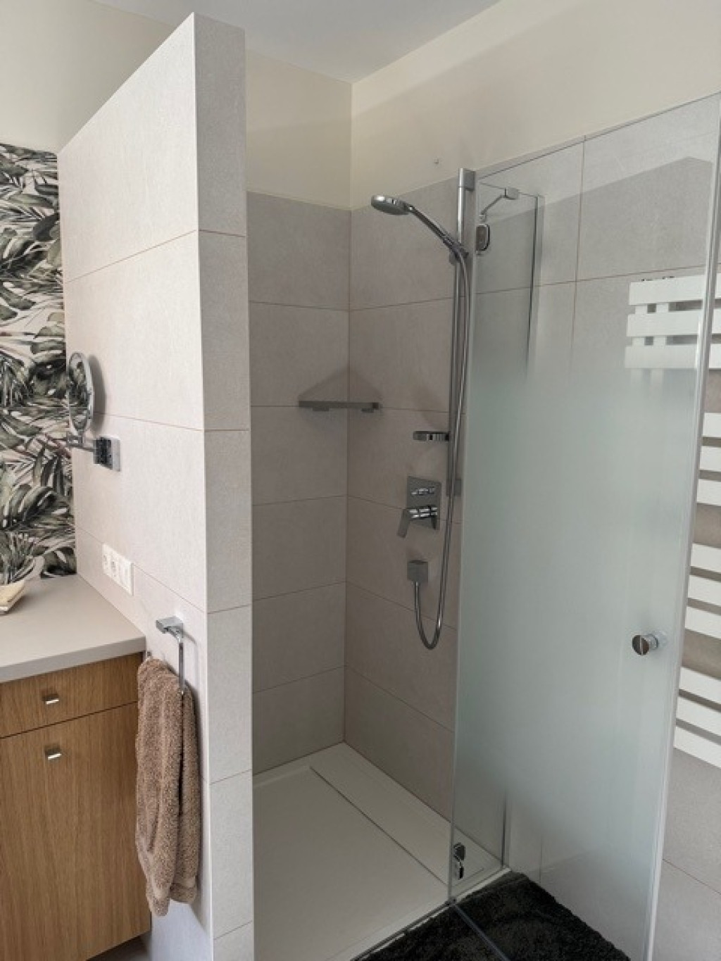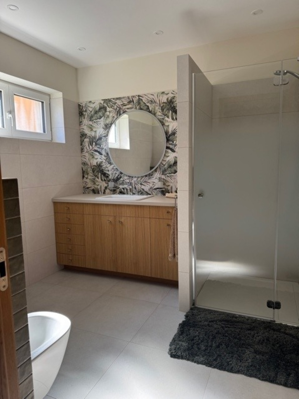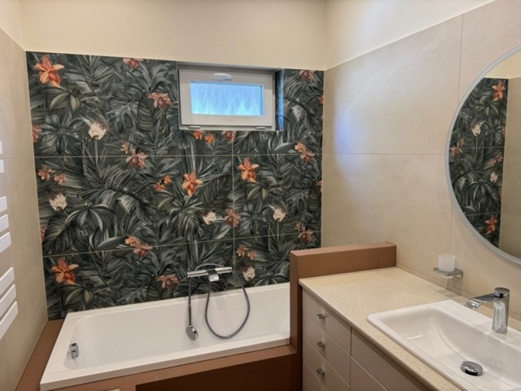 2 fürdőszoba (kádas, zuhanyzós WC-vel, törülközőszárítós radiátorral) és egy vendég WC került kialakításra, az egyik fürdő hálószobából nyílik.