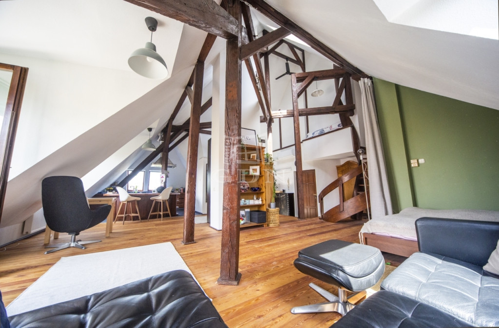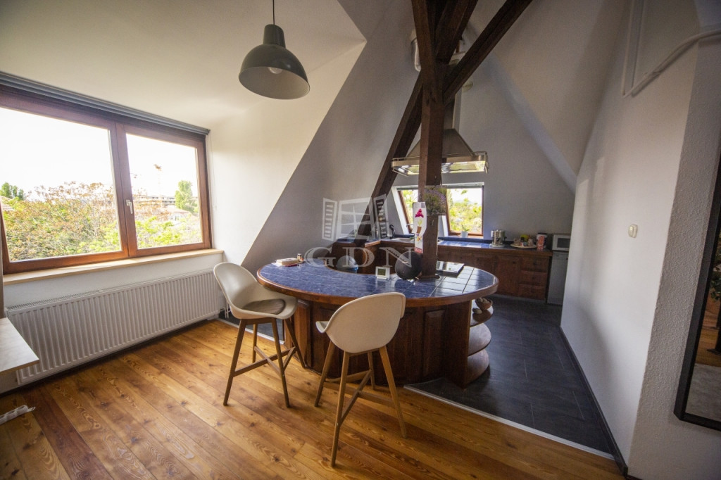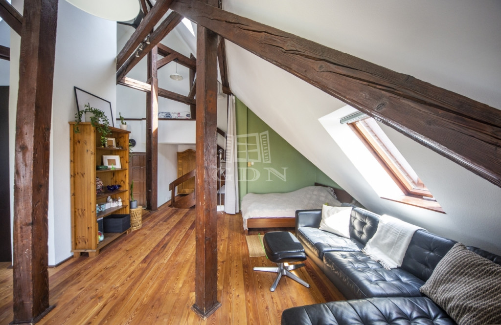 Az újonnan beépített klímával felszerelt lakás belső átriumos kialakítása, valamint a terek elrendezése egyértelműen a klasszikus művész lakás hangulatát árasztja.