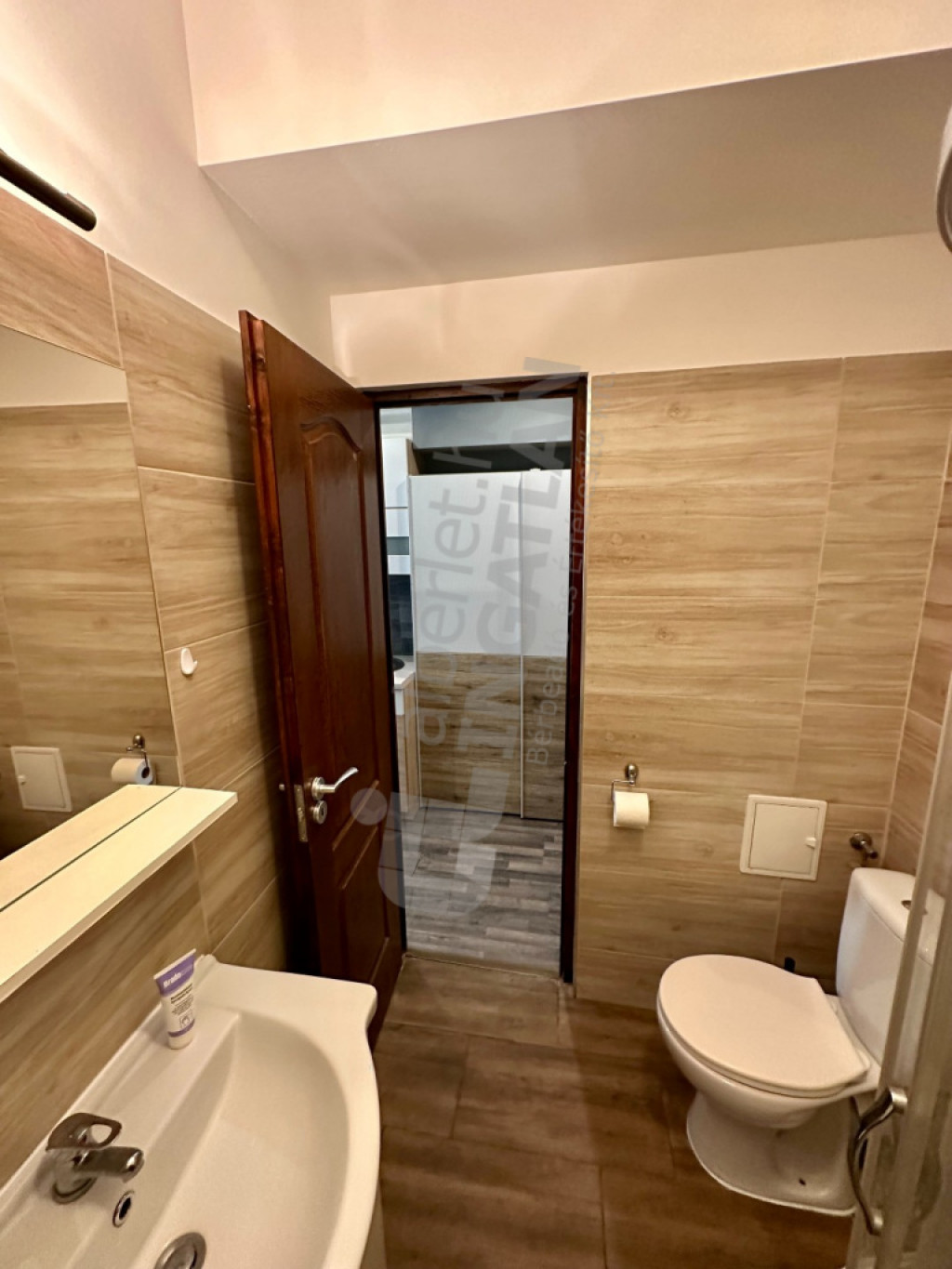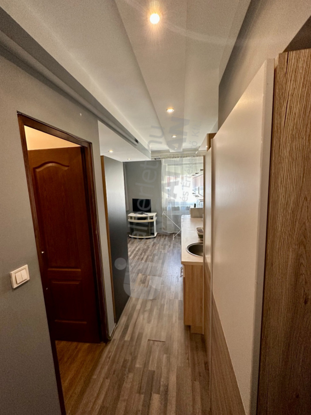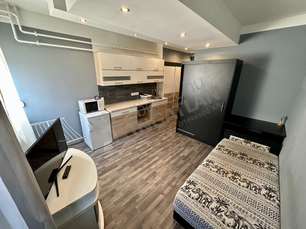 Utcára néző amerikai konyhás szoba, (zuhanyzós fürdőszoba/mosdó egy légtérben).