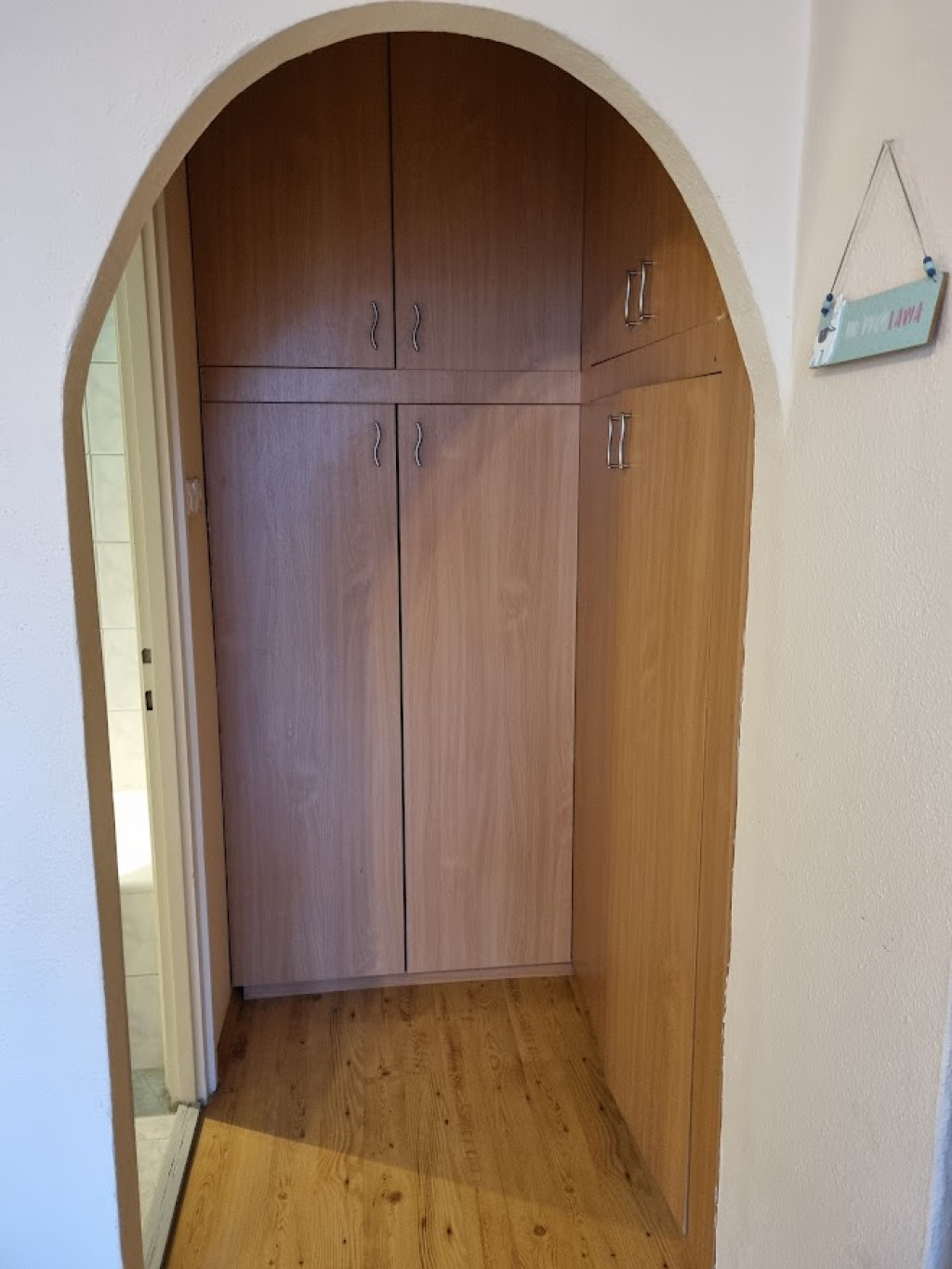 A konyhában gáztűzhely, hűtőszekrény, fagyasztó és mikró, a szobában könyvszekrény, kinyitható kanapé, TV, beépített szekrény található.