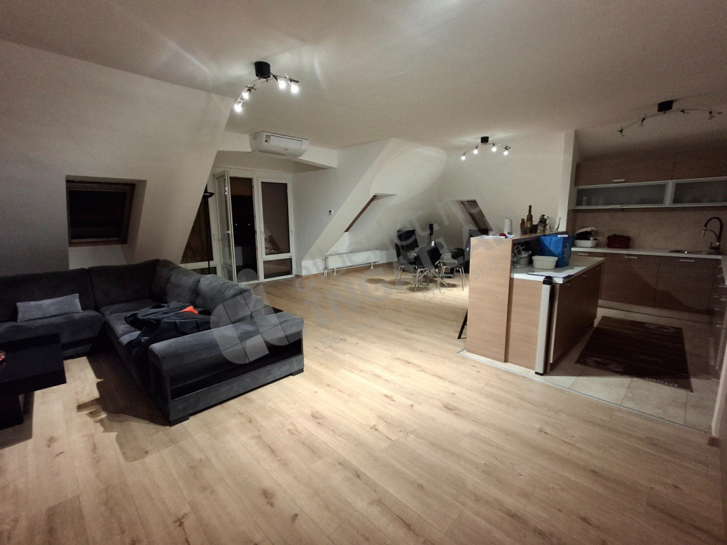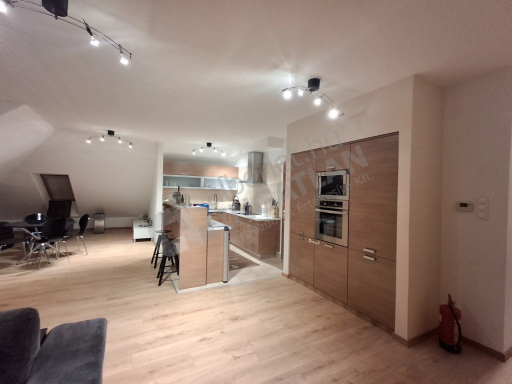 A lakás zárt udvaron belüli, kis lakásszámú társasház tetőterében helyezkedik el, elrendezése kiváló: 3 szoba + amerikai konyhás nappali kamrával, külön zuhany, külön wc, valamint egy kádas fürdőszoba wc-vel kapott helyet benne, a nappaliból pedig panorámás terasz nyílik, és a mellette lévő hálószobából is egy kisebb erkély.