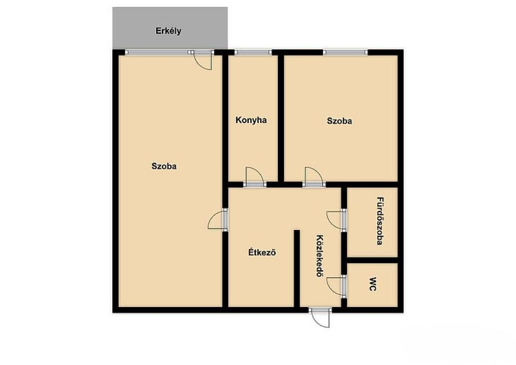 2 szoba, étkező, konyha, kádas fürdőszoba, mellékhelyiség, közlekedő, előszoba, 4 m2-es erkély.
