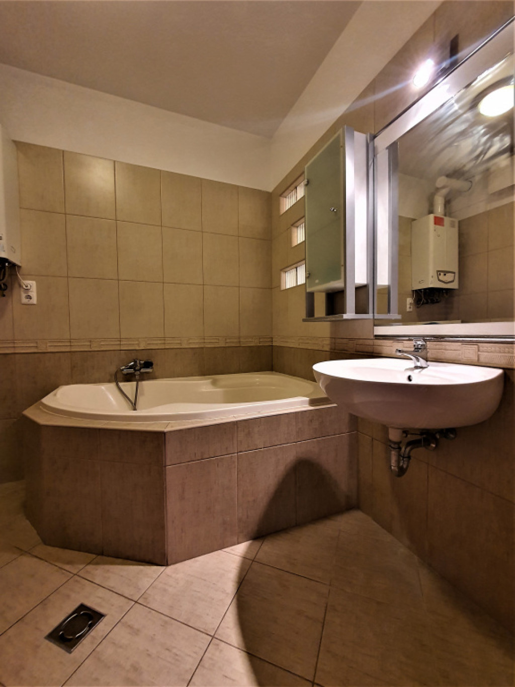 A fürdőszoba kádas kialakítású, egy helyiségben a WC-vel. A fűtést és a meleg vizet biztosító gázcirkó berendezés is itt található.