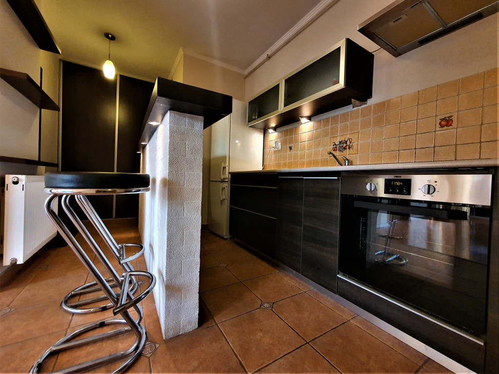 A konyha elektromos sütővel és kerámialapos tűzhellyel, szagelszívóval, hűtővel és konyhai tárolószekrényekkel és egy pulttal is fel van szerelve.