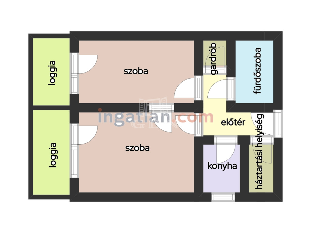 szoba, szoba, hall, fürdőszoba-wc, konyha-étkező, közlekedő-előtér, kamra, gardrób;