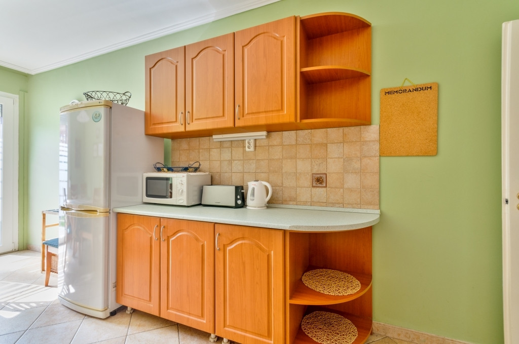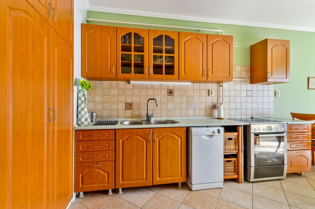 A konyha tűzhellyel, sütővel, mosogatógéppel, fagyasztós hűtőszekrénnyel, mikró hullámú sütővel ellátott. Konyhai eszközökkel, edényekkel, étkezőeszközökkel felszerelt