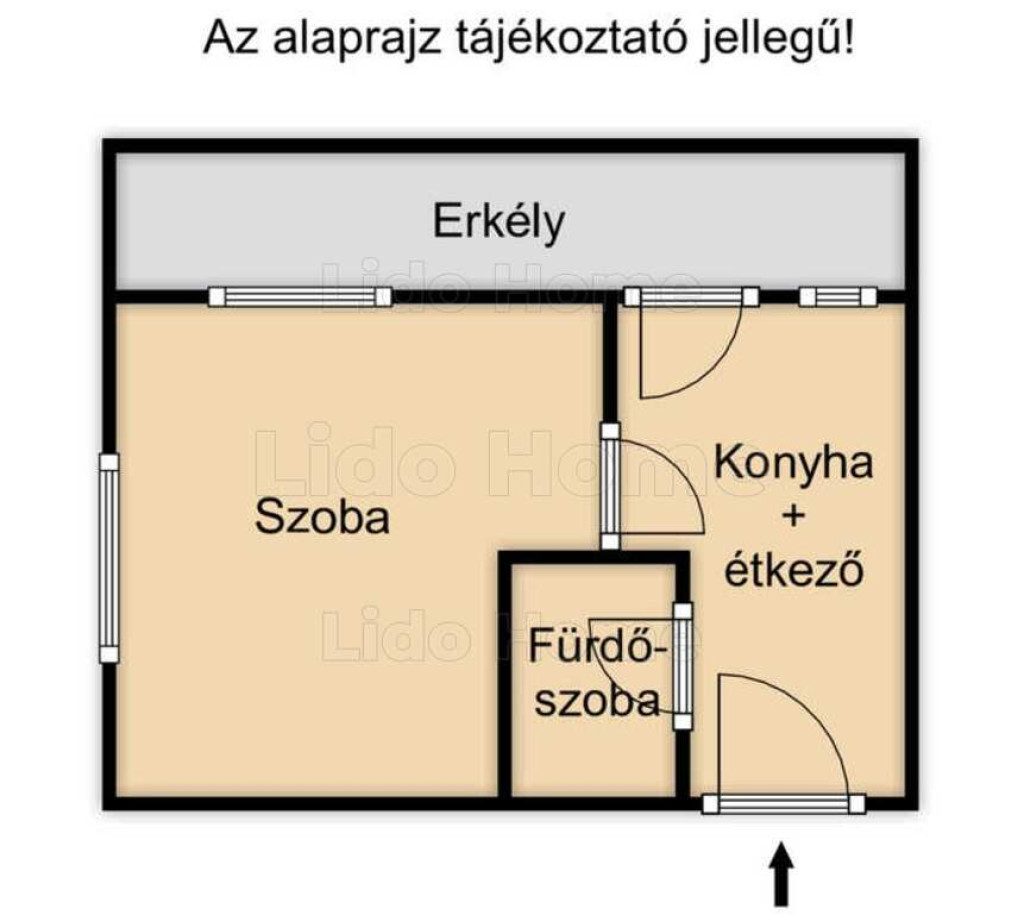 -A lakásban egy szoba, konyha–étkező, valamint zuhanyzós fürdőszoba található.