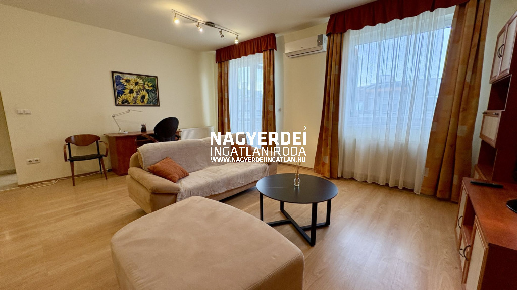 In the center of Debrecen, in the MEDITERRANEAN TERRACE HOUSE, a 60 m² furnished apartment with an American kitchen + living room, 1 bedroom, brick construction, spacious terrace, separate toilet, bathroom, and pantry is available for rent.