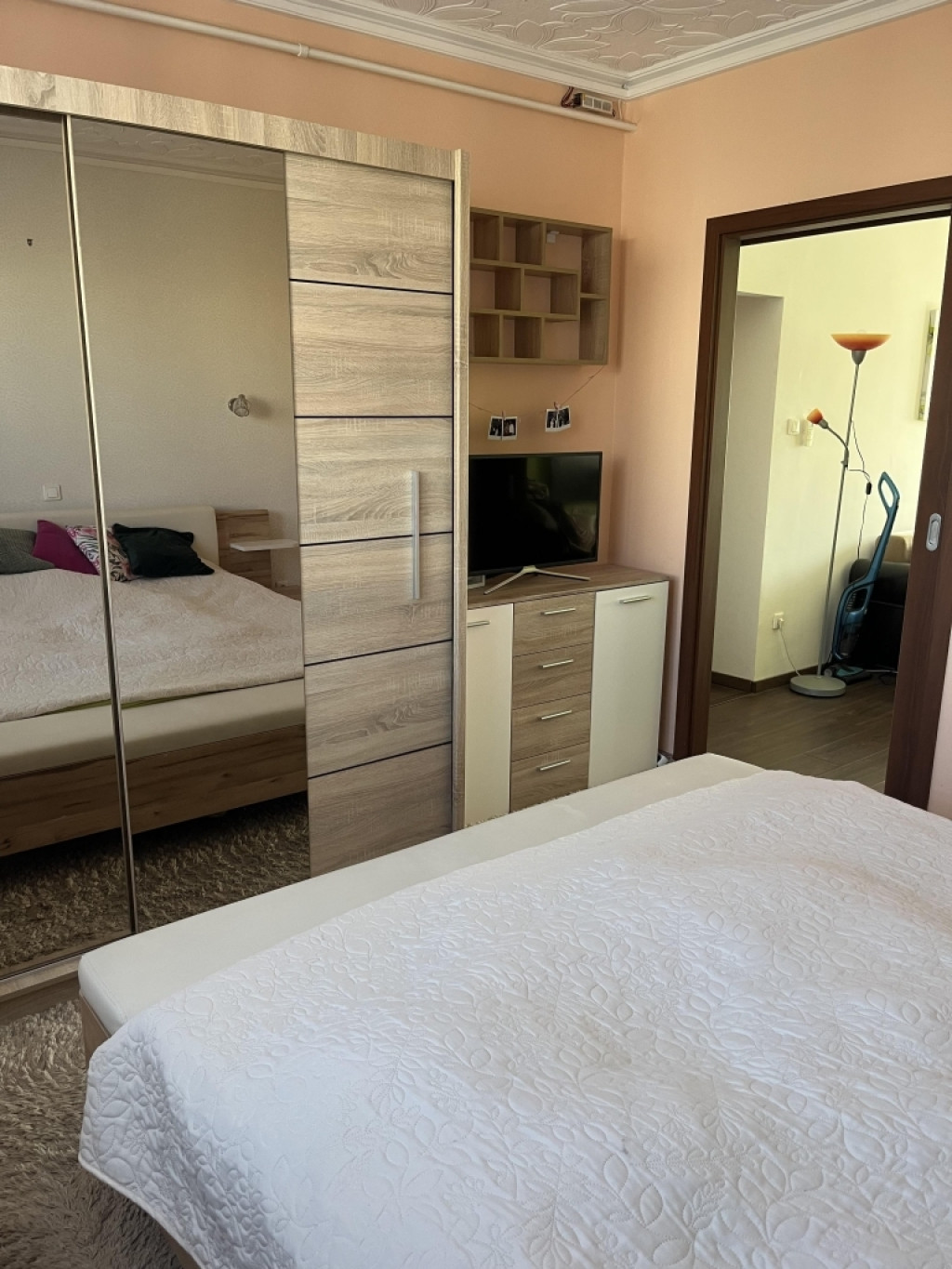 Comfortable double bed, large mirrored wardrobe, and calm pastel tones.