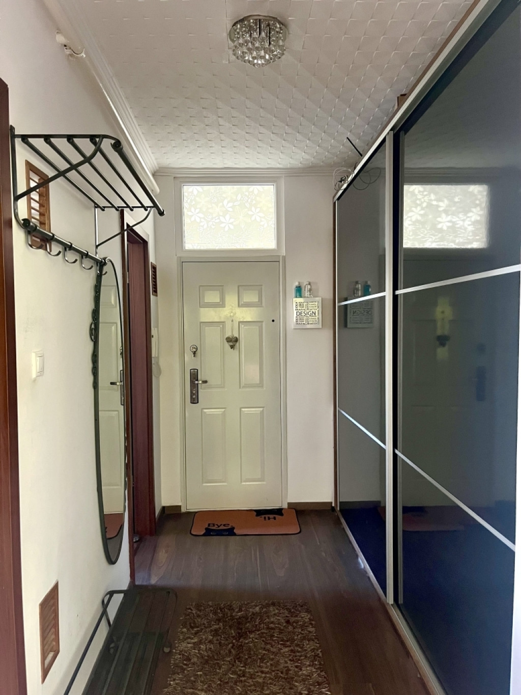 Előszobában tágas beépített szekrény, praktikus tárolási lehetőségekkel.