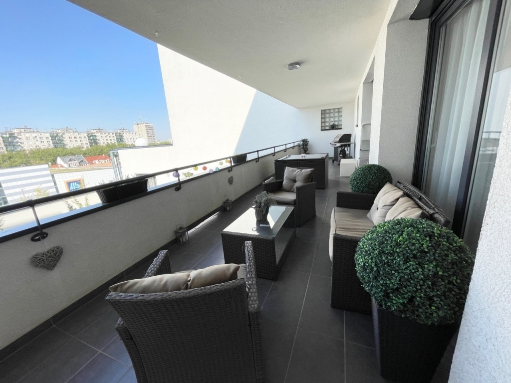 A lakás bútorozott, gépesített. A szobák külön nyílnak, a nappaliban klíma van. Fürdőszoba és wc külön van. Házközponti fűtésű. Műanyag nyílászárók redőnnyel, felszereltek. 33 nm-es nagy terasz tartozik hozzá. Lift van. Dohányzás egyáltalán nem megengedett, állat nem hozható. Az épület szigetelt.