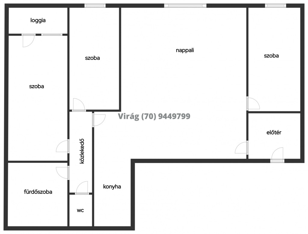 - Elrendezés, előszoba, konyha + étkező egy térben, nappali, 2 külön nyíló szoba, közlekedő, fürdő, WC, 4 m²-es loggia.