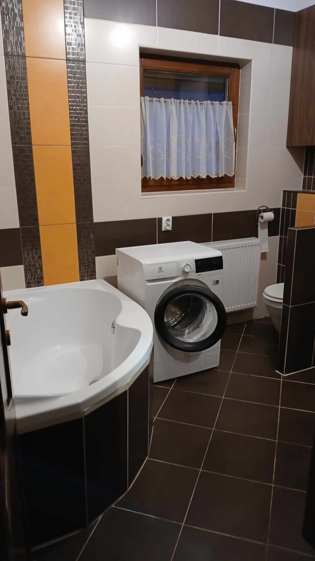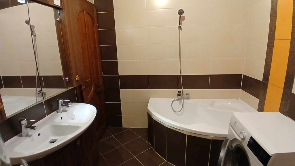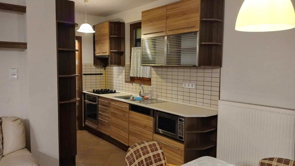A lakás bútorozott, teljes körűen gépesített, ideértve a mosogatógépet is. Nappaliban L-alakú kanapé, étkezőasztal székekkel. Konyharészben beépített konyhabútor.