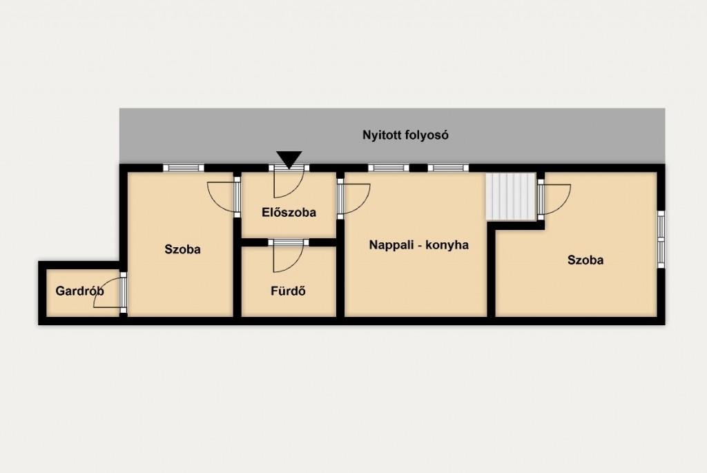 - nappali-konyha-étkező + 1 szoba, 1 félszoba, egyik szobából nyíló kis gardrób helyiség, fürdőszoba (zuhanyzós) és wc egyben, előszoba
