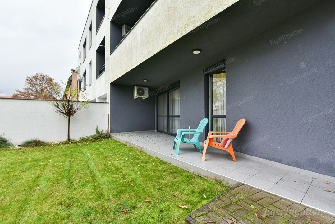 A lakáshoz tartozik 100 m² saját kert, egy 40 m²-es terasz, valamint egy fedett loggia.