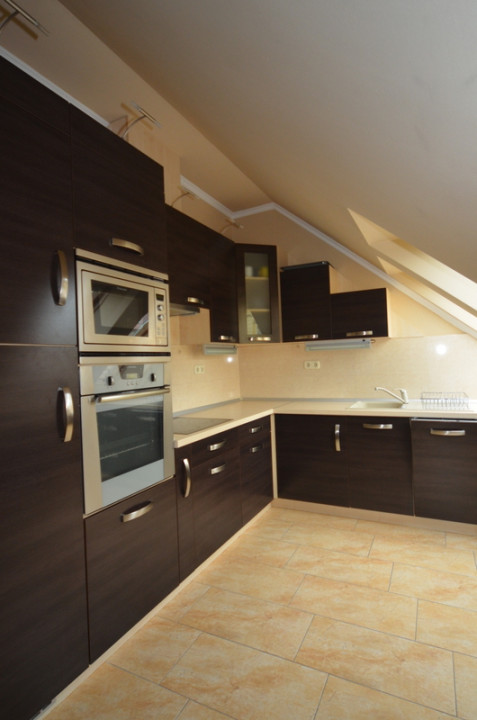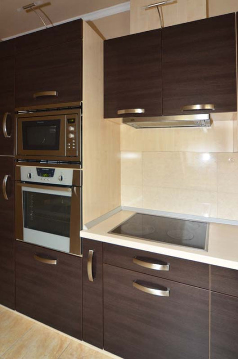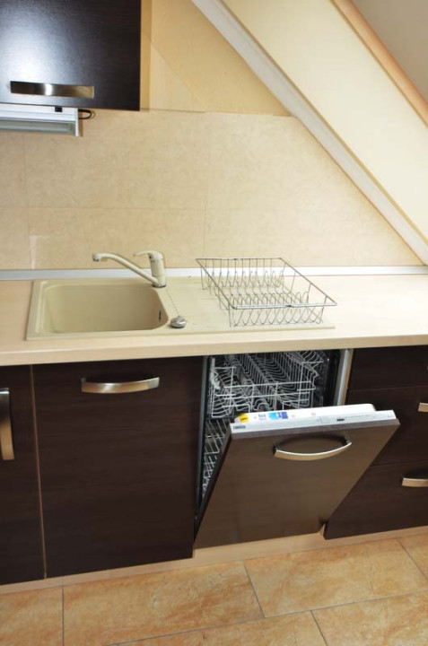 Teljesen felszerelt konyha: kerámialapos tűzhely, elektromos sütő, beépített mikró, elszívó, mosogatógép, beépített hűtő