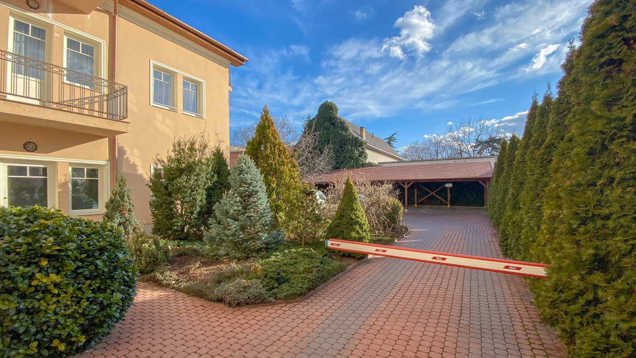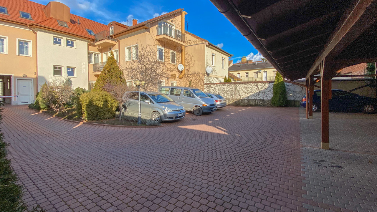 Parkolás: zárt udvarban, sorompóval védett, fedett gépkocsibeálló 2 autó részére