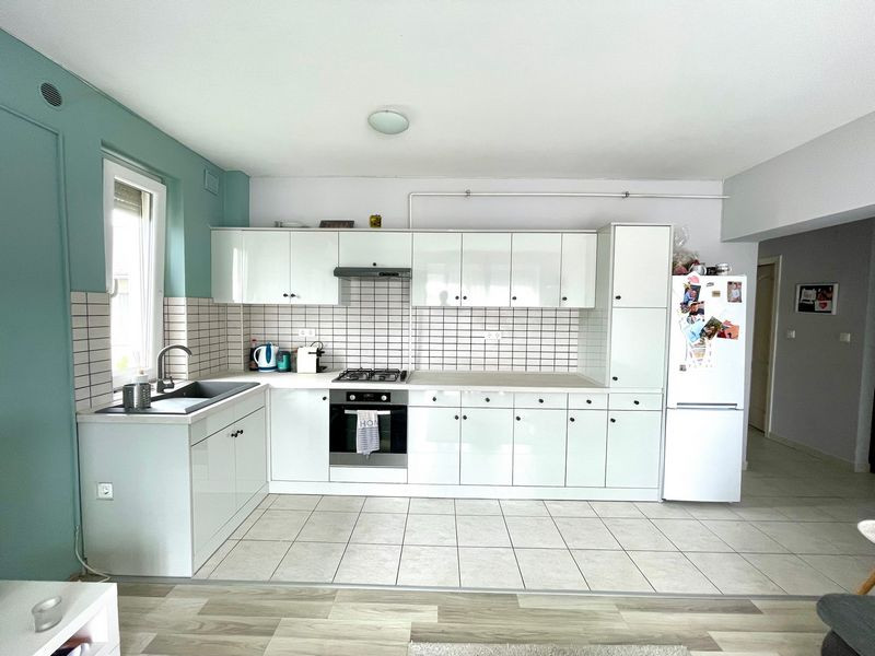 Az ingatlan felosztása a következő (65m2 + francia erkély): előtér, wc, fürdő, szoba, szoba, konyha – étkező – nappali, francia erkély.