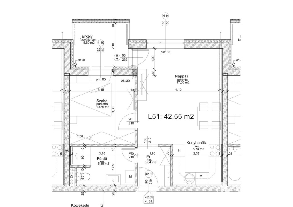 Az ingatlan egy liftes társasház negyedik emeletnén található, alapterülete: 42,55m2, egy nappaliból nyíló 5,69 m2-es erkéllyel.