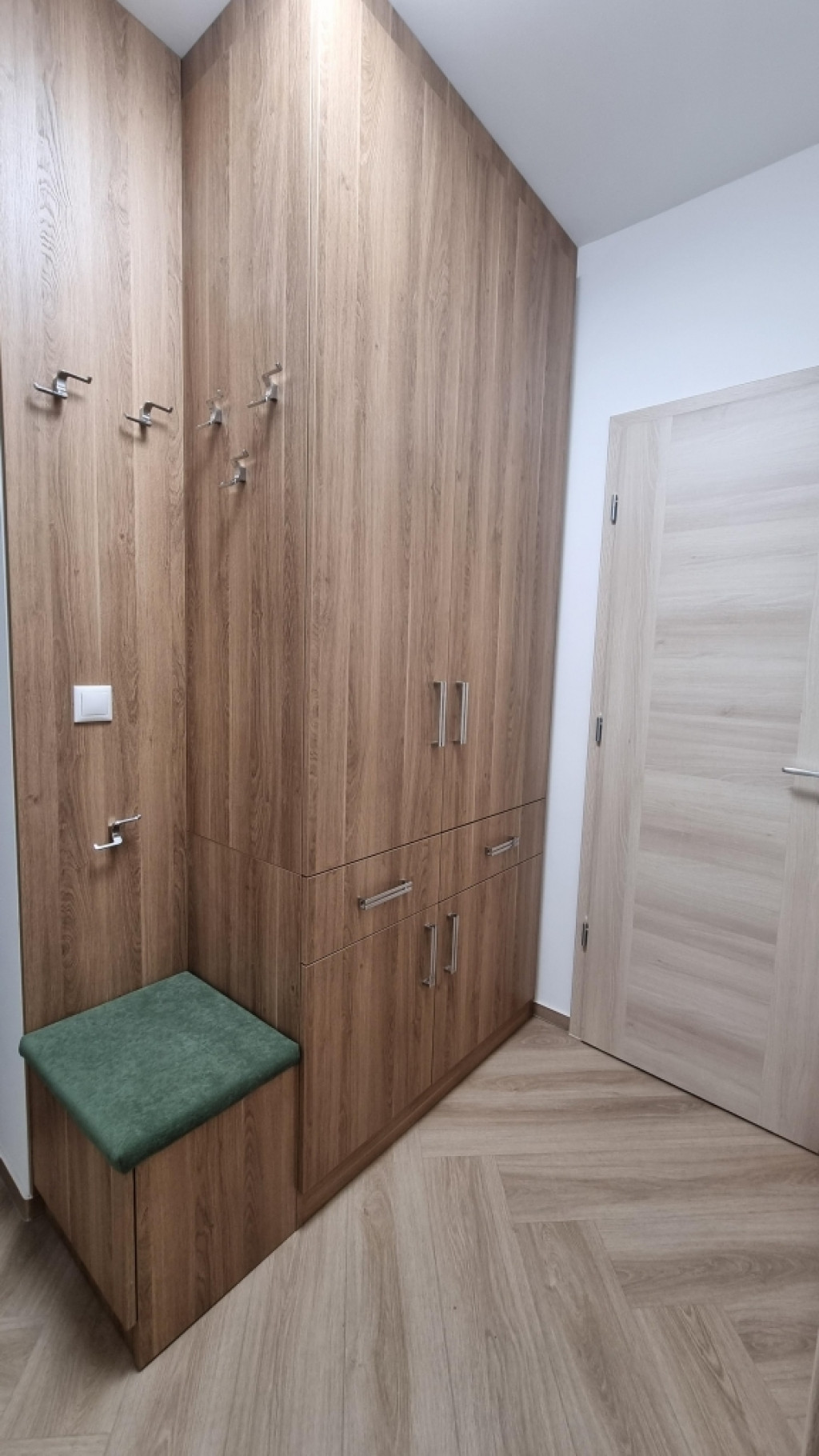 A közlekedőben elhelyezett gardróbszekrény könnyíti a holmik tárolását.