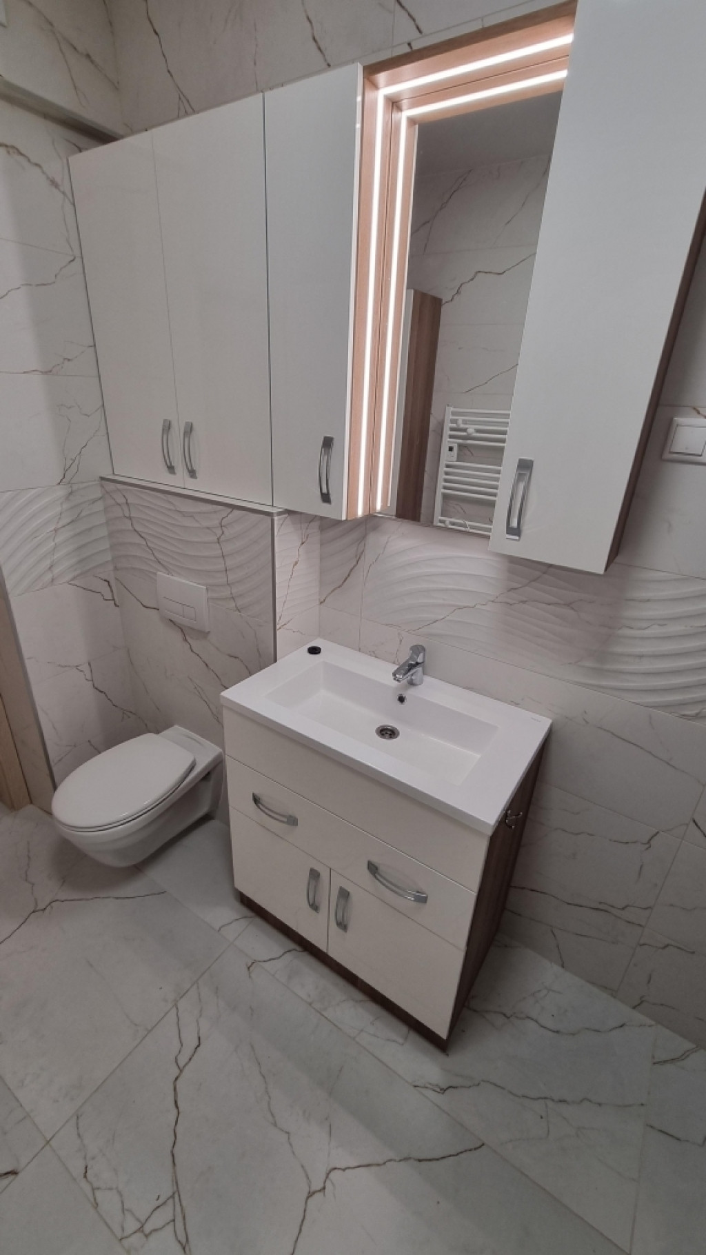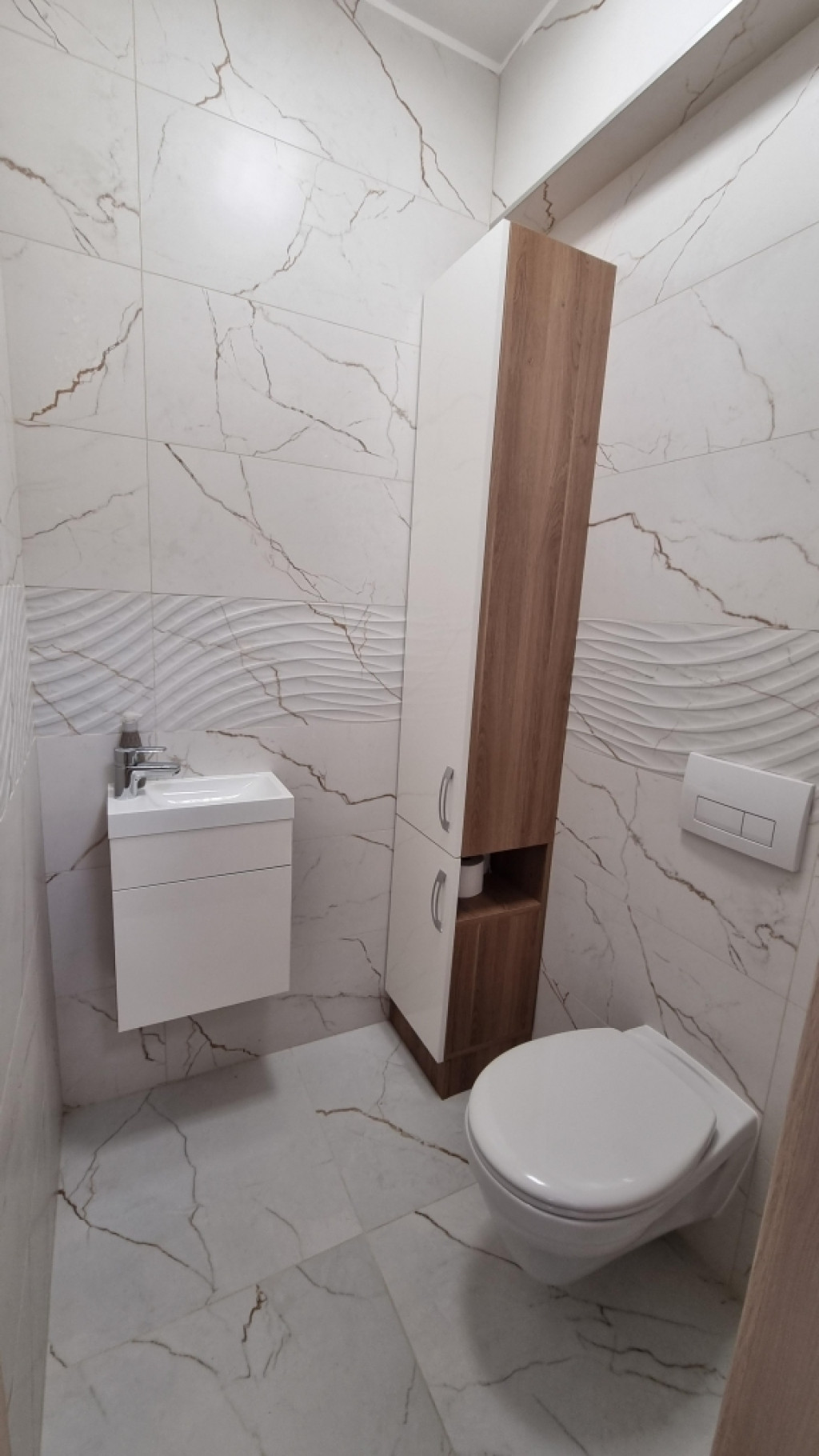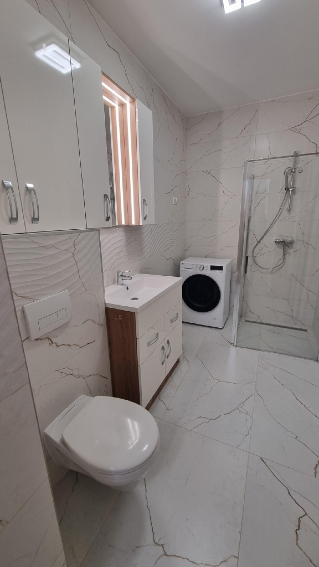 Fürdőszoba zuhanyzós. Tartozéka: mosó-szárítógép egyben, tárolós szekrények, törölközőszárító. Wc-vel együtt van, de egy külön wc is van.