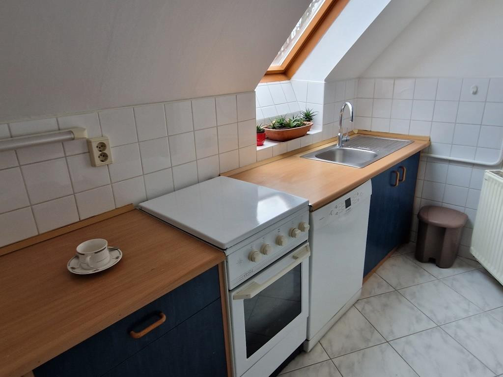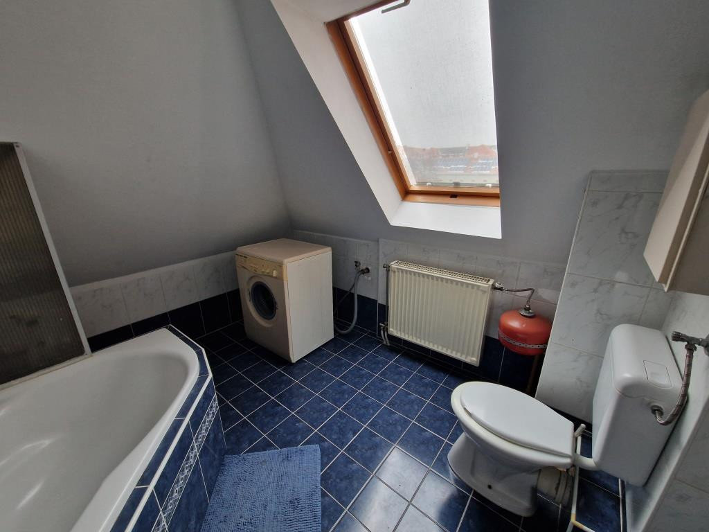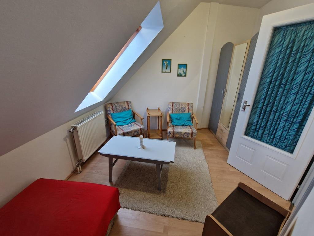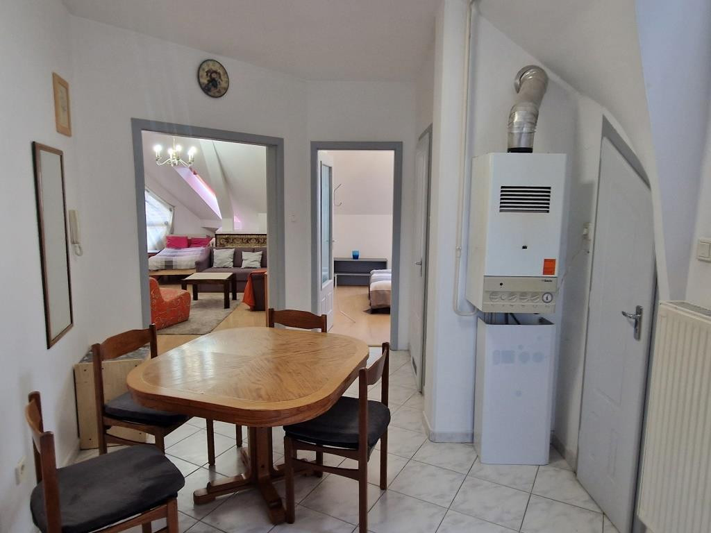 Kaposvár belvárosában, a Teleki utcában kínáljuk bérbevételre ezt a belső kétszintes, 1 + 3 félszobás lakást. Alapterülete 87 m2, a társasház harmadik emeletén helyezkedik el. Alsó szintjén a tágas előtér étkezőként is szolgál, innen nyílik a konyha, a nagyobb méretű nappali szoba, az egyik félszoba, egy zuhanyzós fürdő, valamint egy kis kamra. Innen vezet fel a lépcső a felső szintre, ahol találunk még egy fürdőt sarokkáddal, és két kisebb hálószobát. A lakás tágas, világos, barátságos, elrendezése praktikus. Fűtése saját gázkazánnal megoldott, és légkondi berendezés is van. A lakás a képeken látható bútorzattal és háztartási gépekkel együtt kiadó. Van lehetőség garázst is bérelni, ennek ára plusz 25 EFt havonta. Nemdohányzó bérlőt keresünk hosszabb távra, legalább egy évre, aki a kéthavi bérleti díjnak megfelelő összegű kaució és az első havi bérleti díj kifizetése után beköltözhet. Dohányzás és állattartás tilos.