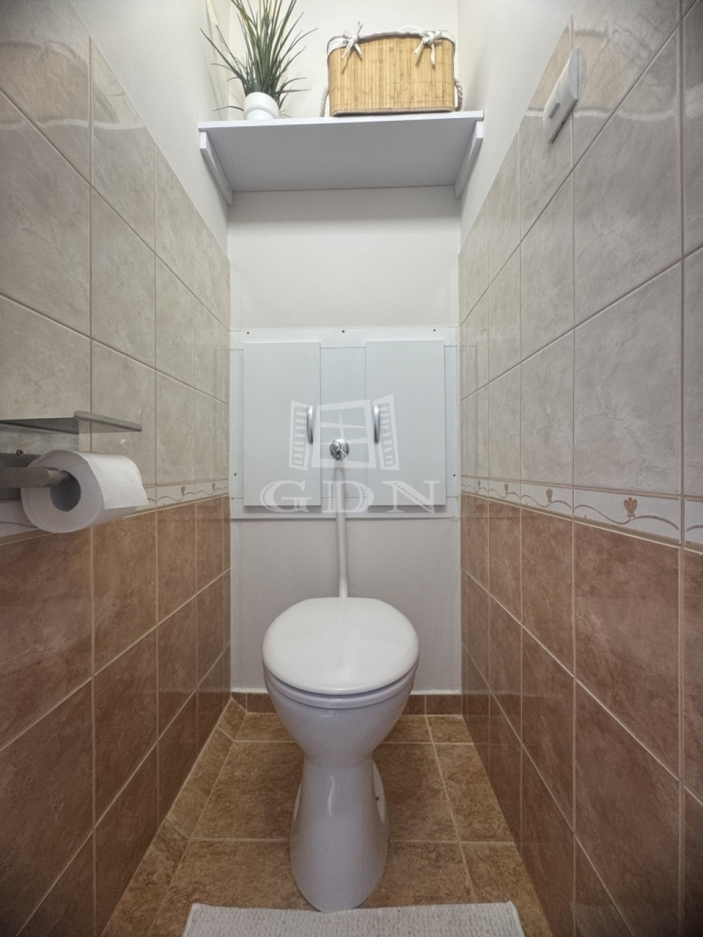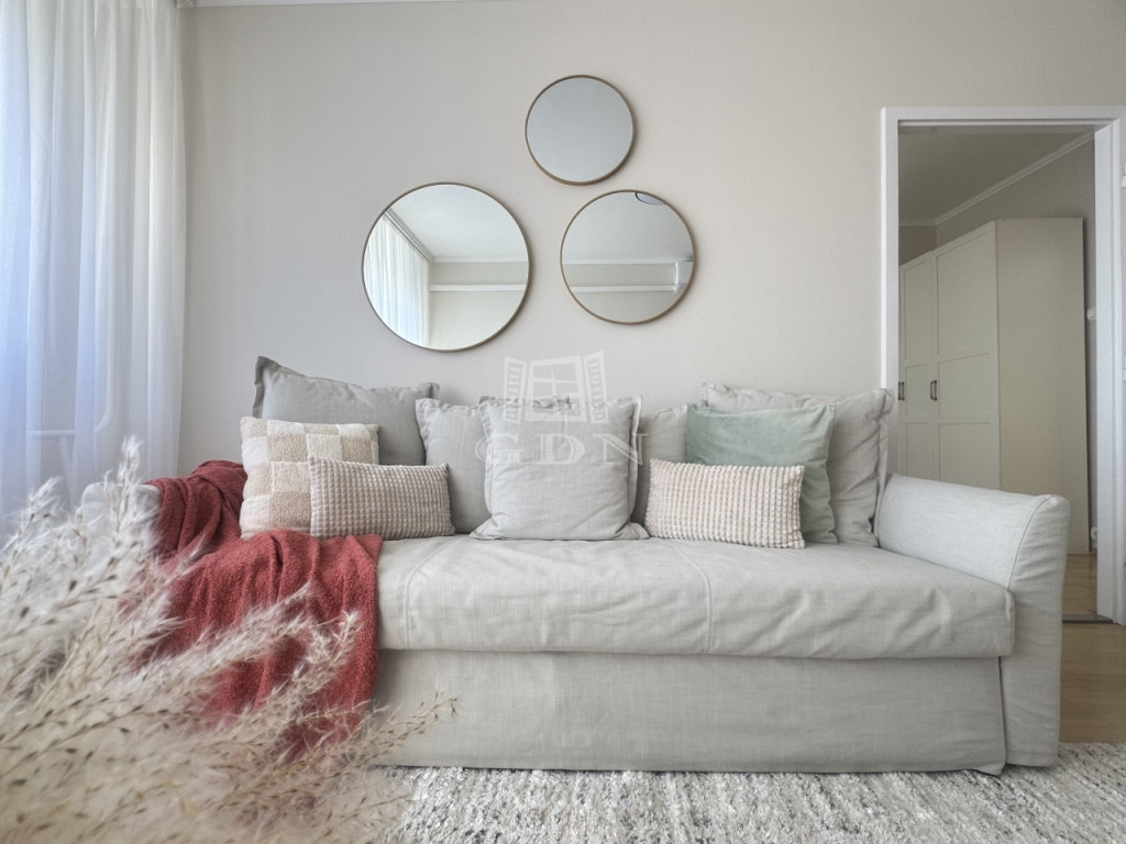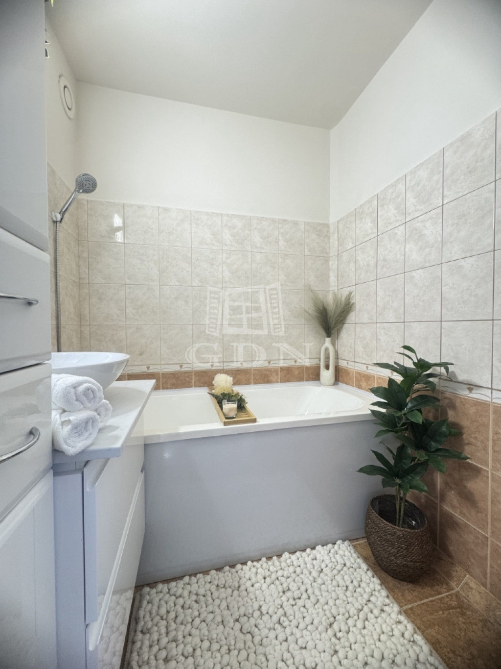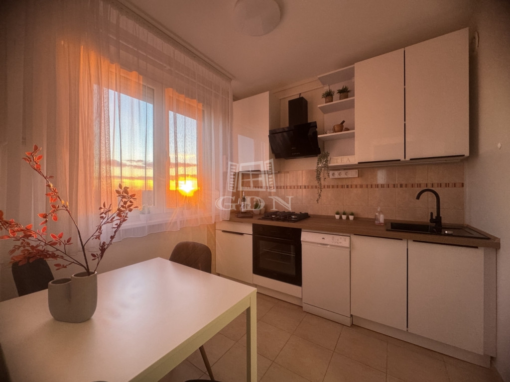A napsütötte nappaliban ágyazható, kényelmes kanapé, nagyméretű TV szekrény kapott helyet, és kialakításra került egy kényelmes dolgozósarok is, így a home office sem lehet akadály a leendő bérlő számára. A hálószoba tágas, nagyméretű franciaággyal, minőségi ágymatraccal, gardróbszekrénnyel felszerelt. A modern, új konyha teljesen új beépített gépekkel (gáz főzőlap, hőlégkeveréses sütő, páraelszívó, mosogatógép), a konyhapult LED világítással felszerelt. Az étkezőasztal körbeülhető, és igény szerint kinyitható. Igazi kuriózum, hogy a konyhából esténként csodás naplementében gyönyörködhetünk. A kádas, hangulatos fürdőszobában LED-es tükör, fiókos mosdószekrény és mosógépkiállás biztosítják a kényelmet a mindennapokban. A WC külön helyiségben került elhelyezésre. A háztartási helyiség nagy tárolókapacitásával tovább fokozza a lakás praktikusságát. A lakás bejárata előtt egy 3 nm, saját használatú, zárható előtér tovább növeli a lakás komfort- és biztonságérzetét.