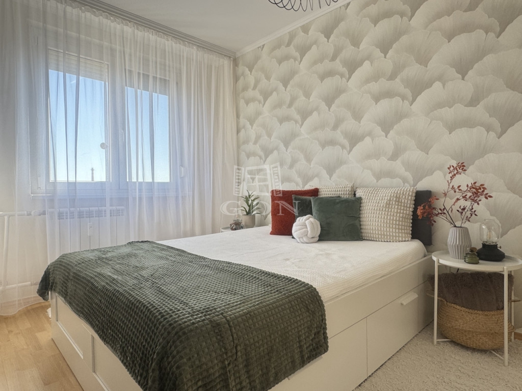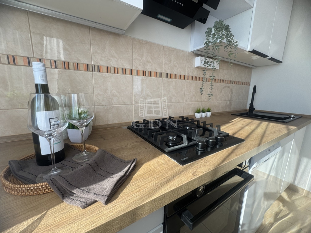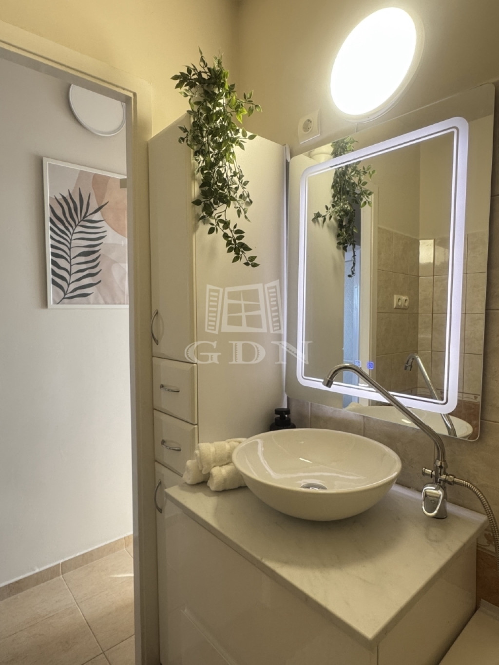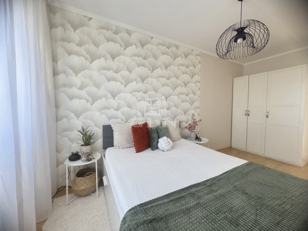 A napsütötte nappaliban ágyazható, kényelmes kanapé, nagyméretű TV szekrény kapott helyet, és kialakításra került egy kényelmes dolgozósarok is, így a home office sem lehet akadály a leendő bérlő számára. A hálószoba tágas, nagyméretű franciaággyal, minőségi ágymatraccal, gardróbszekrénnyel felszerelt. A modern, új konyha teljesen új beépített gépekkel (gáz főzőlap, hőlégkeveréses sütő, páraelszívó, mosogatógép), a konyhapult LED világítással felszerelt. Az étkezőasztal körbeülhető, és igény szerint kinyitható. Igazi kuriózum, hogy a konyhából esténként csodás naplementében gyönyörködhetünk. A kádas, hangulatos fürdőszobában LED-es tükör, fiókos mosdószekrény és mosógépkiállás biztosítják a kényelmet a mindennapokban. A WC külön helyiségben került elhelyezésre. A háztartási helyiség nagy tárolókapacitásával tovább fokozza a lakás praktikusságát. A lakás bejárata előtt egy 3 nm, saját használatú, zárható előtér tovább növeli a lakás komfort- és biztonságérzetét.