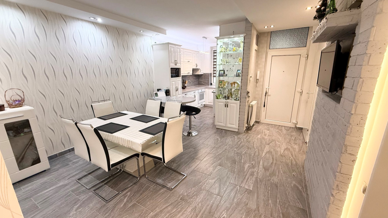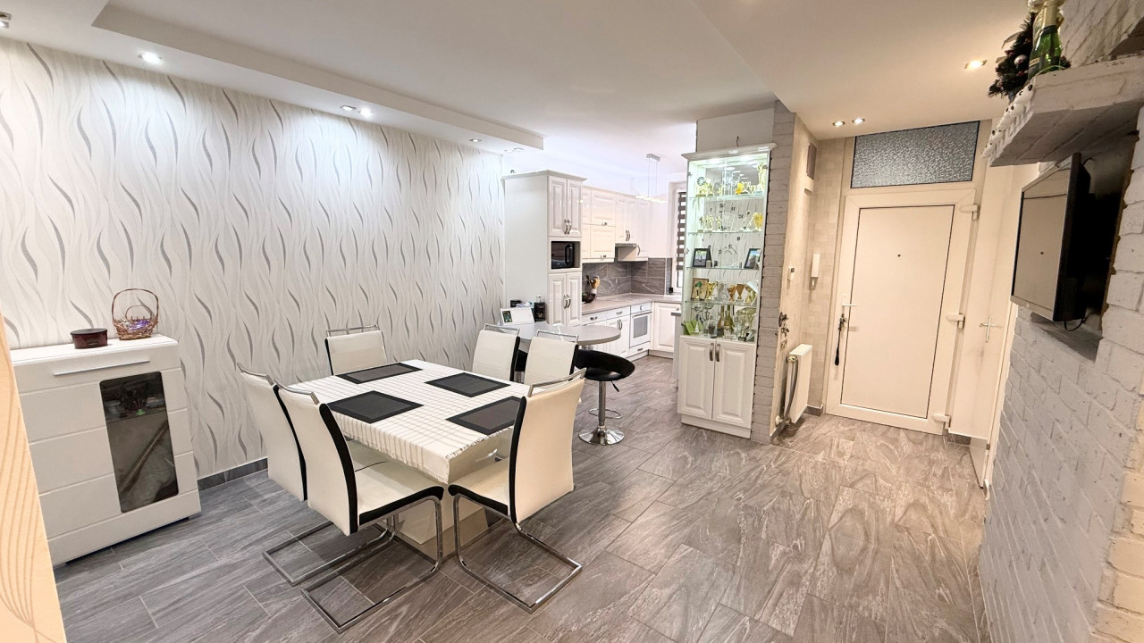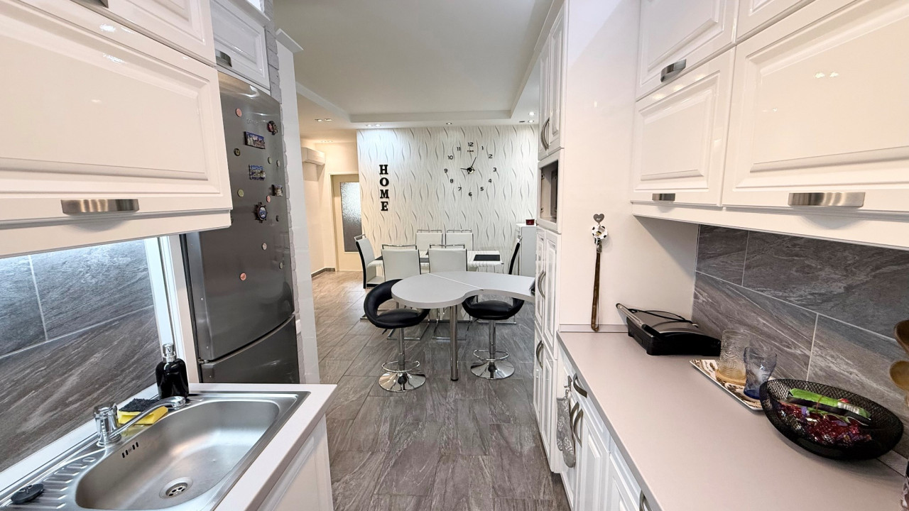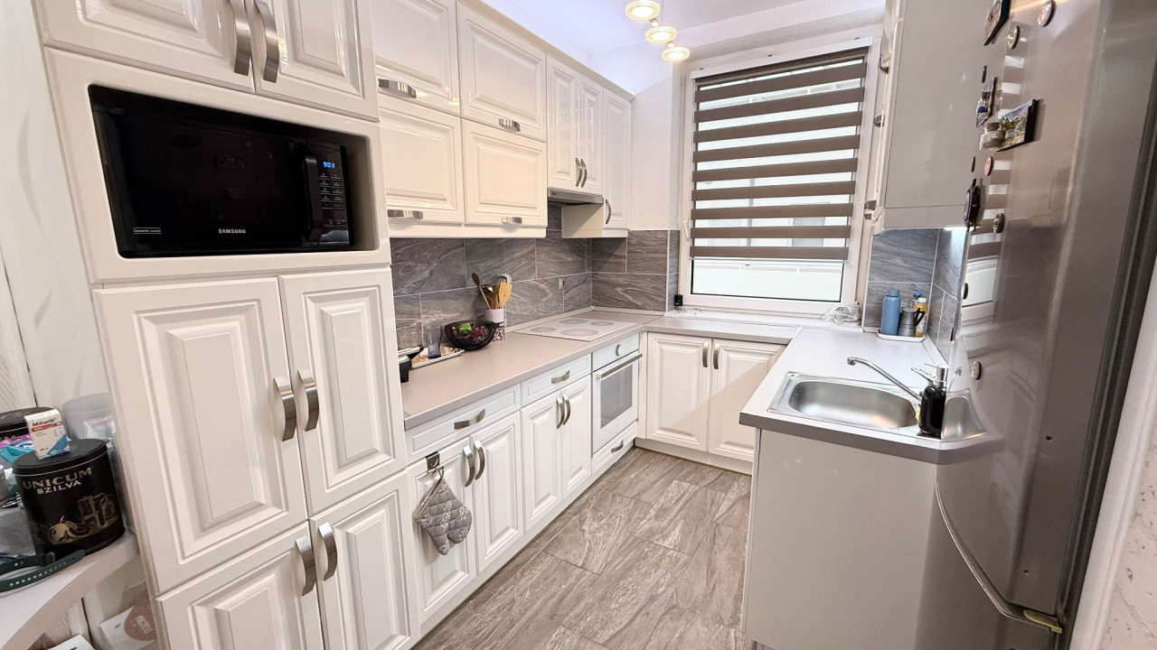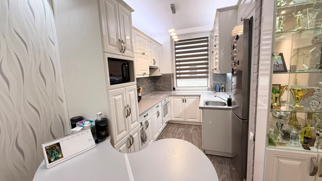 A konyha esztétikailag és műszakilag is kiemelkedő: magasfényű, igényesen kialakított, teljesen gépesített konyhabútor áll rendelkezésre. A lakás ízlésesen bútorozott és teljes körűen gépesített, így az új bérlő számára költözhető.
