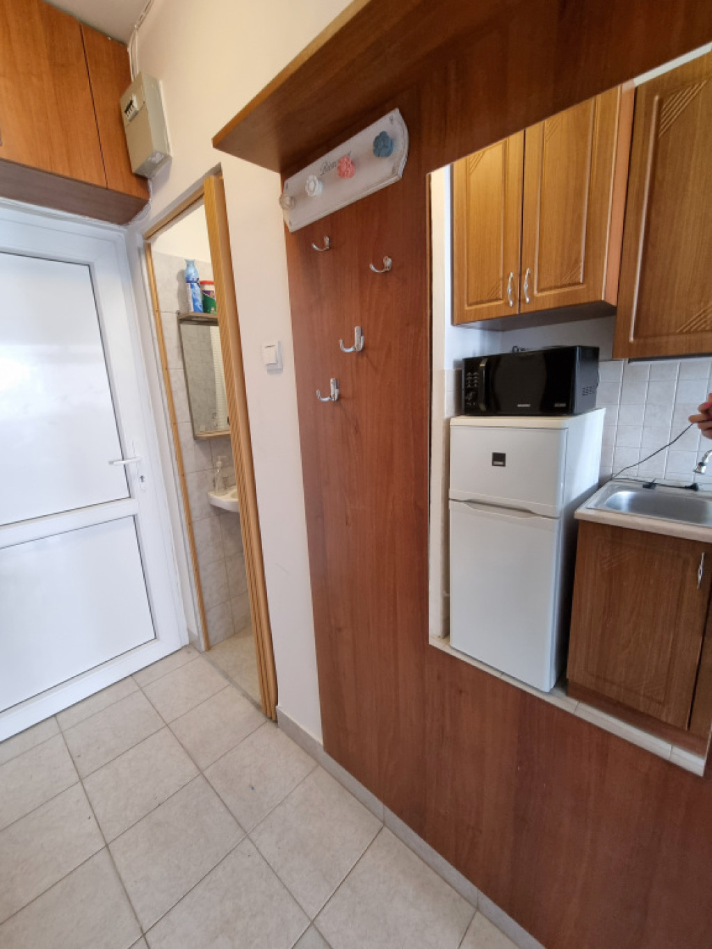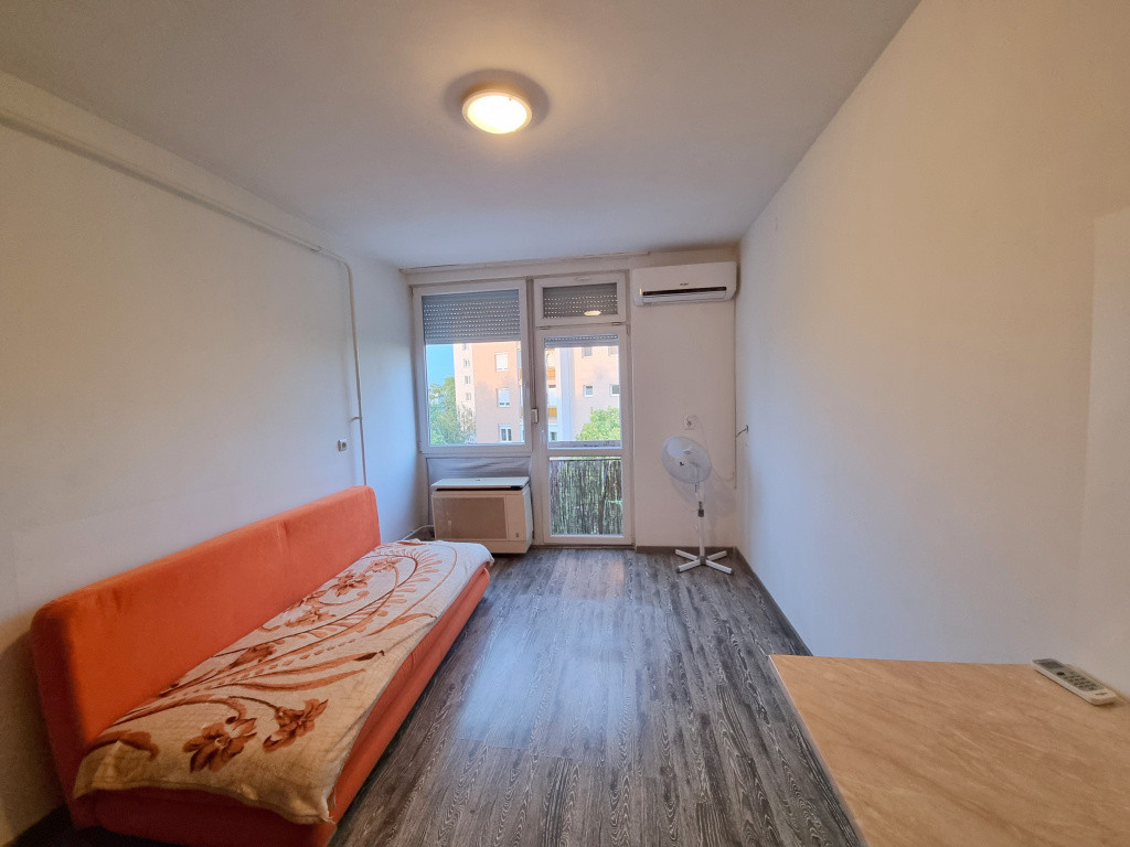 Nyíregyháza, Vasvári Pál utcán 21 m2-es, gázkonvektoros, alacsony fenntartási költségű, IV. emeleti, KLIMATIZÁLT, bútorozott minigarzon hosszú távra, 1 fő számára LIFT NÉLKÜLI épületben.