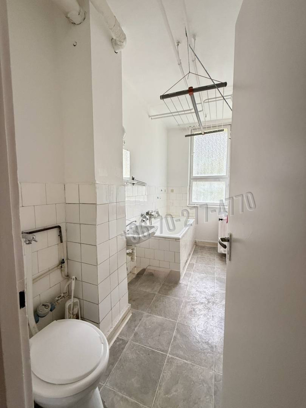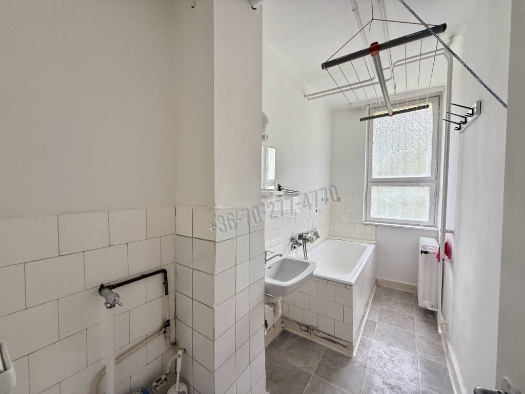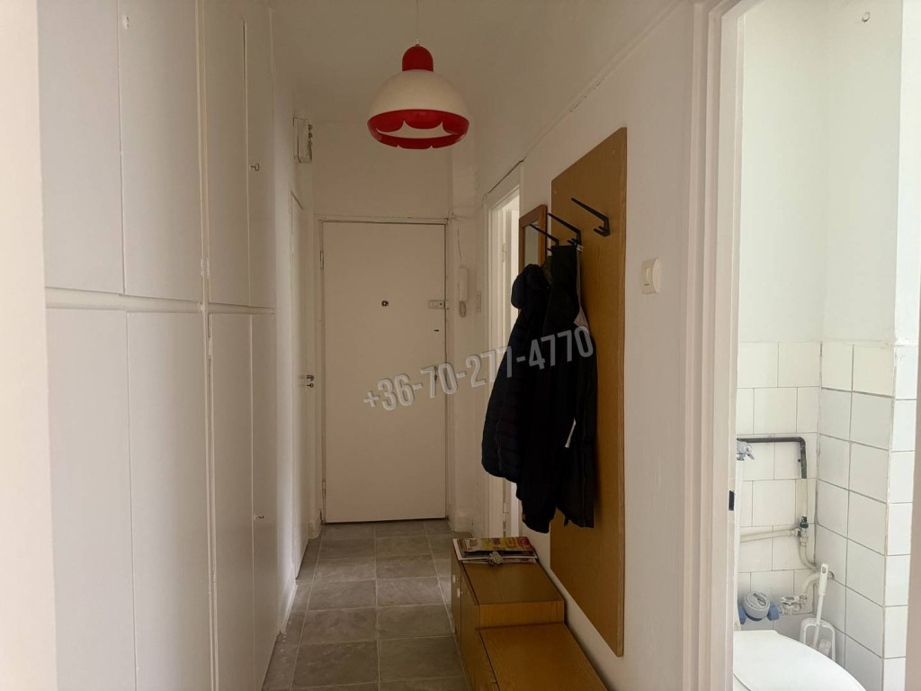 A lakás egy szobás, a fürdőszobában mosdó, kád és wc csésze egy helyiségben található. Az előszobában beépített szekrény és spejz segíti a tárolást, a konyhában csak a konyhabútor található.