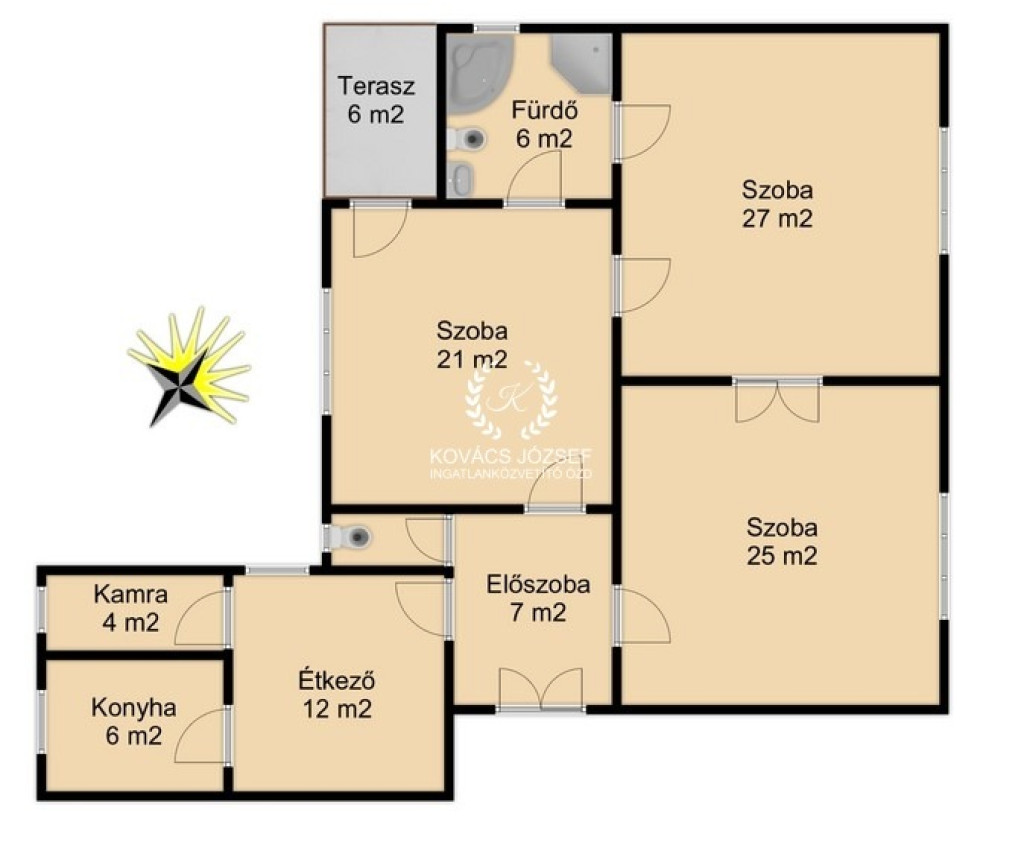 Az ablakok és a bejárati ajtó műanyagból vannak, így csendes és energiatakarékos az otthon. Négy irányba nyílnak az ablakok, így bőséges fényben részesülsz. A fűtés igazán kedvező és sokoldalú: távhő egyedi mérőórával, továbbá két hűtő-fűtő klíma és egy hangulatos cserépkályha segítenek a kellemes hőmérséklet fenntartásában.